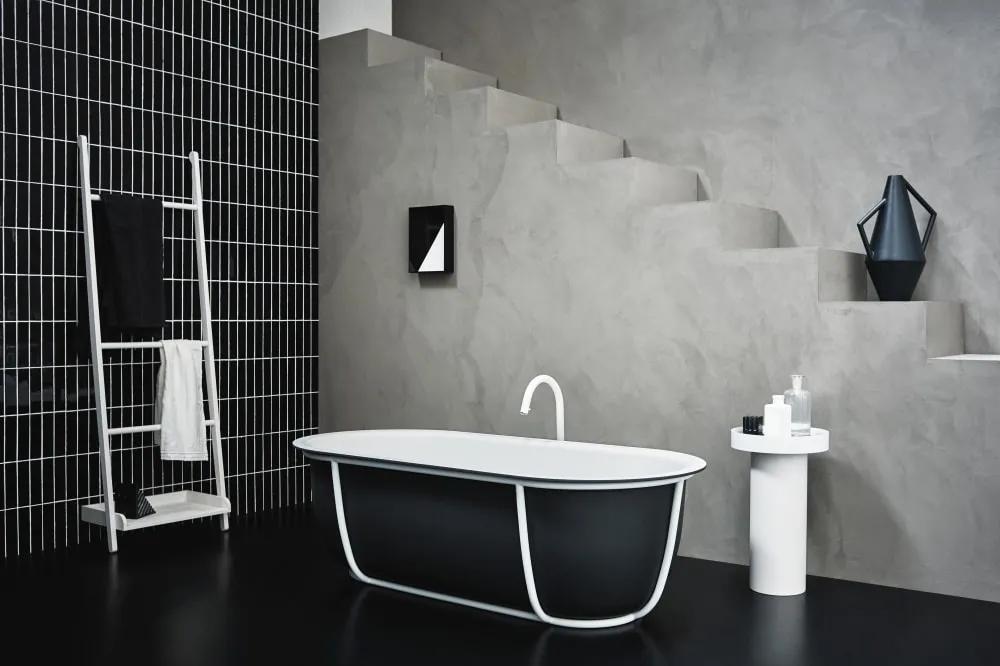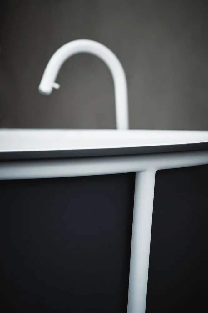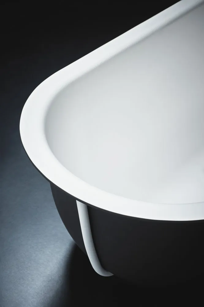 Проект, основанный на глубоком знании материалов и производственных процессов, ванна коллекции Cuna от Agape изготовлена из твердой поверхности термоформованного белого или светло-серого или темно-серого цвета снаружи, с несущей конструкцией из стальной трубы, окрашенной в белый, светло-серый, черный или полированный матовый.