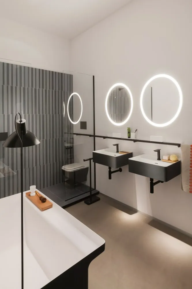 Ванна Marsiglia, которая напоминает форму древних умывальников и особенно подходит для небольших помещений благодаря своей правильной форме и небольшой длине, повторяет ту же элегантность и функциональность умывальников.