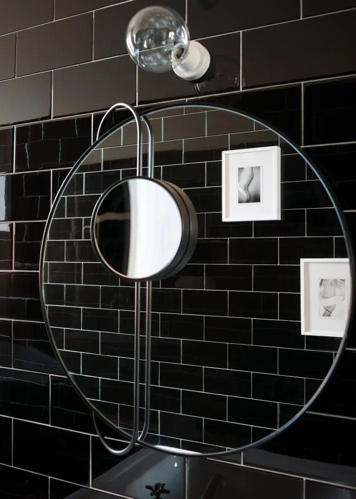 Зеркало, изготовленное из МДФ, окрашенного в черный цвет, может быть установлено с увеличителем как справа, так и слева.