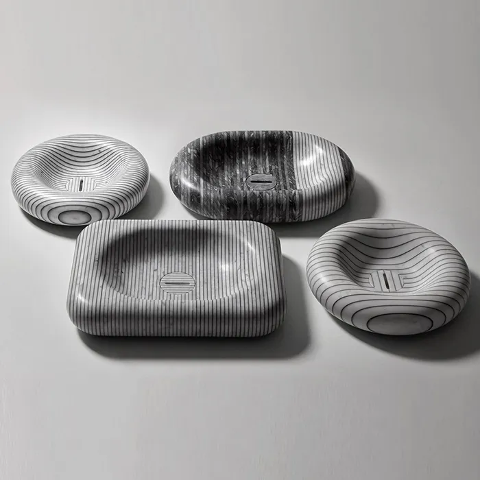 Коллекция, основанная на творчестве и мышлении человека и полученная благодаря точности станка, представляет собой мягкий и извилистый объем с обволакивающими линиями, полученный путем соединения 2-сантиметровых листов каррарского мрамора, склеенных между собой с помощью цветной смолы.
