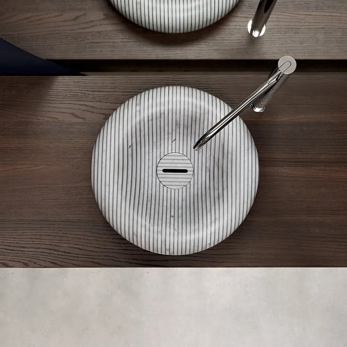 Совершенство в своем деле, передовые технологии обработки, креативность и отсылки к миру моды - вот темы, которые исследует Gessati, коллекция раковин с верхним креплением, воспроизводящая мотив параллельных линий, характерный для некоторых предметов одежды.