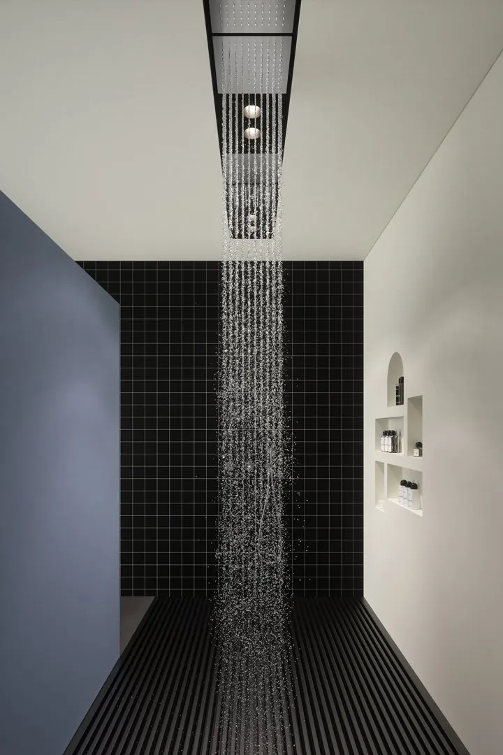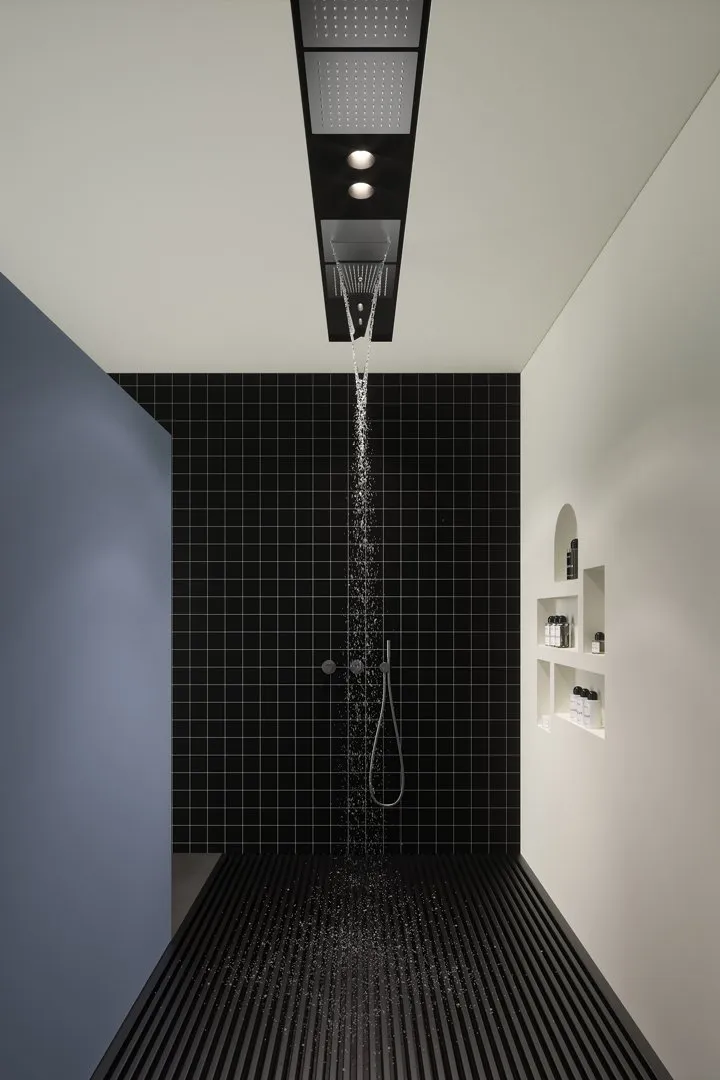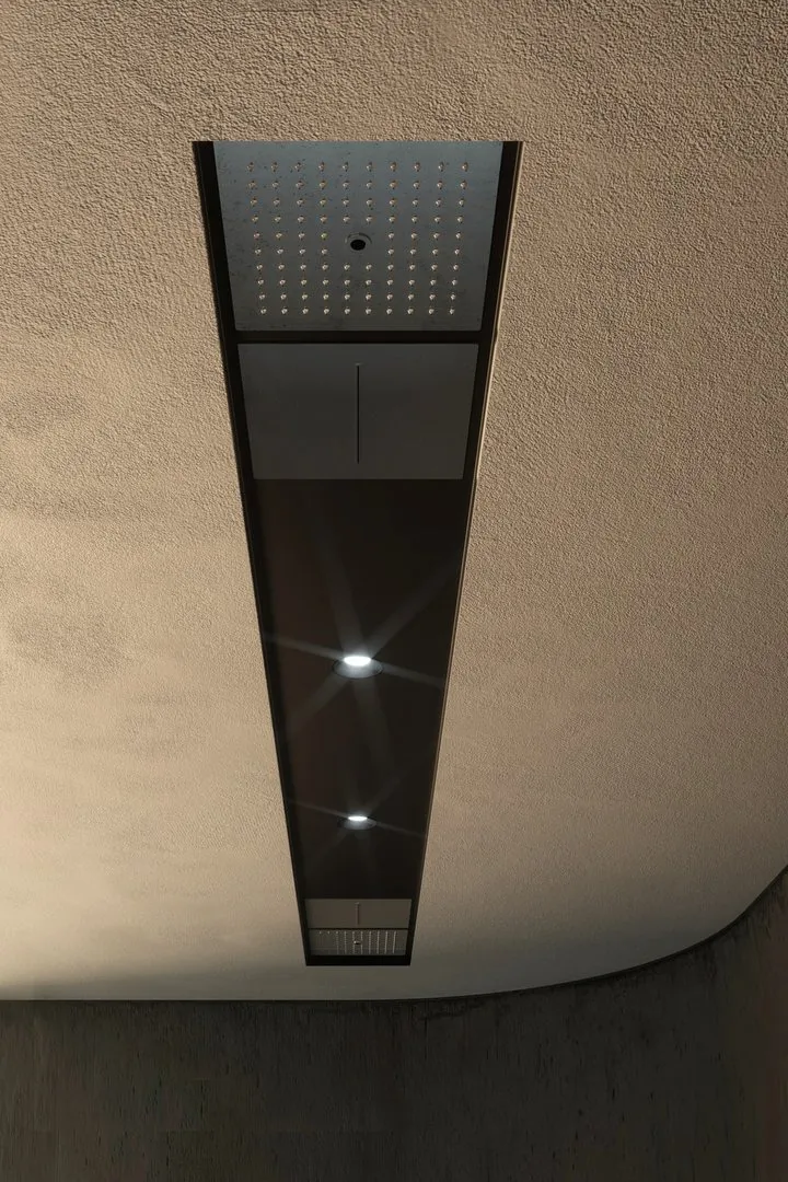 С помощью простой ниши в гипсокартоне вы можете создать дорожку для размещения желаемых элементов: водопада, ливня, струи дождя с гвоздями в нужной последовательности, чтобы создать необычную и уникальную душевую насадку коллекции Lamattonella от Antonio Lupi.