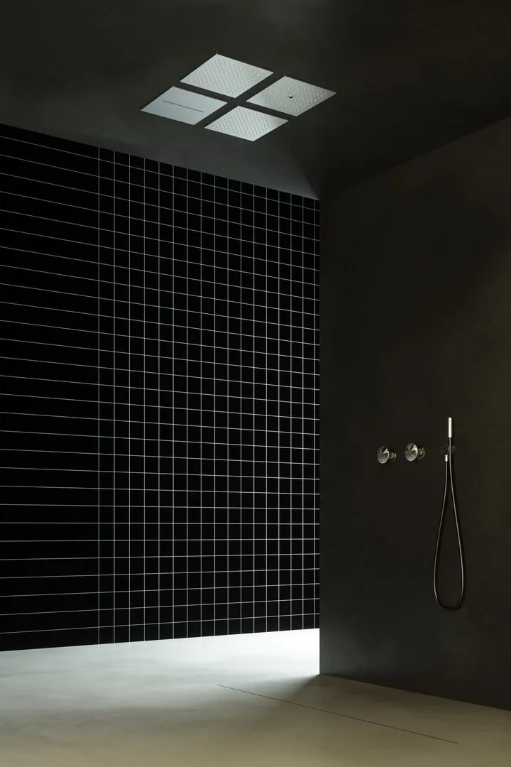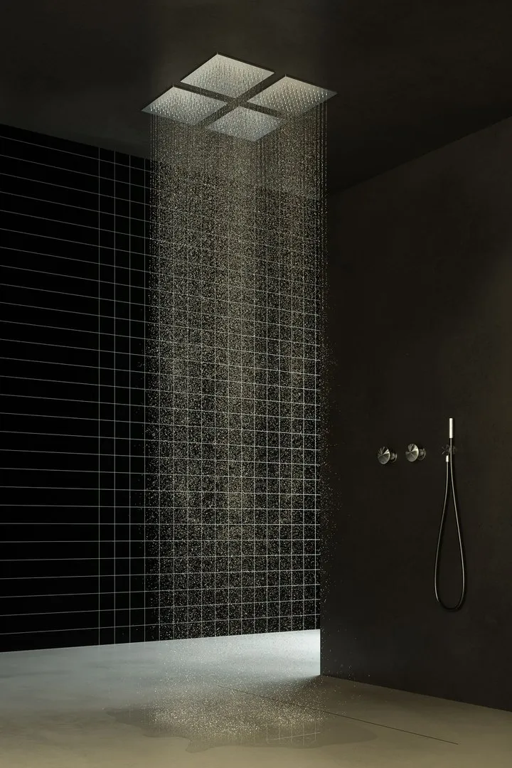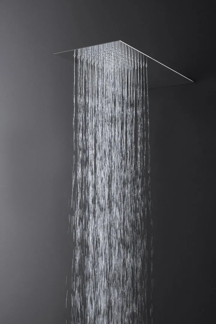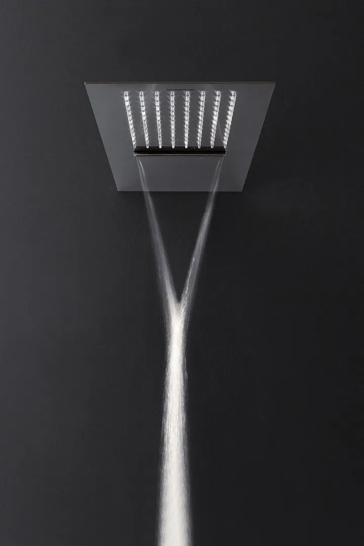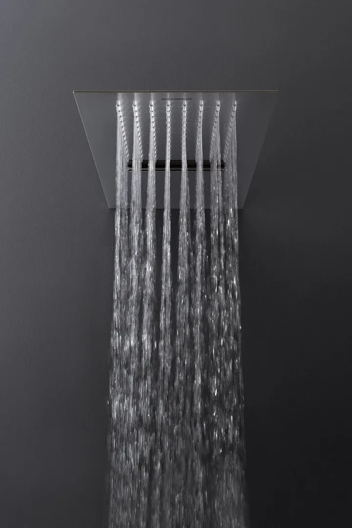 Каждая насадка для душа, изготовленная из полированной нержавеющей стали, выполняет одну функцию - дождевания, каскадного или одноструйного, и может быть установлена рядом, поскольку они идентичны по форме и размеру. Насадка, встроенная в потолок, имеет минимальную толщину и может свободно располагаться, создавая эффект облицованной плиткой поверхности, с которой стекает вода.