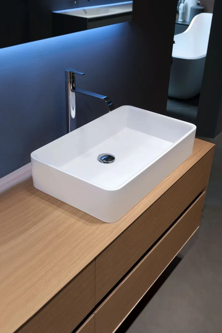 Мягкая геометрия бортика является отличительной чертой прямоугольной раковины коллекции Servoretto от Antonio Lupi, изготовленной из дерева Flumood o Colormood.