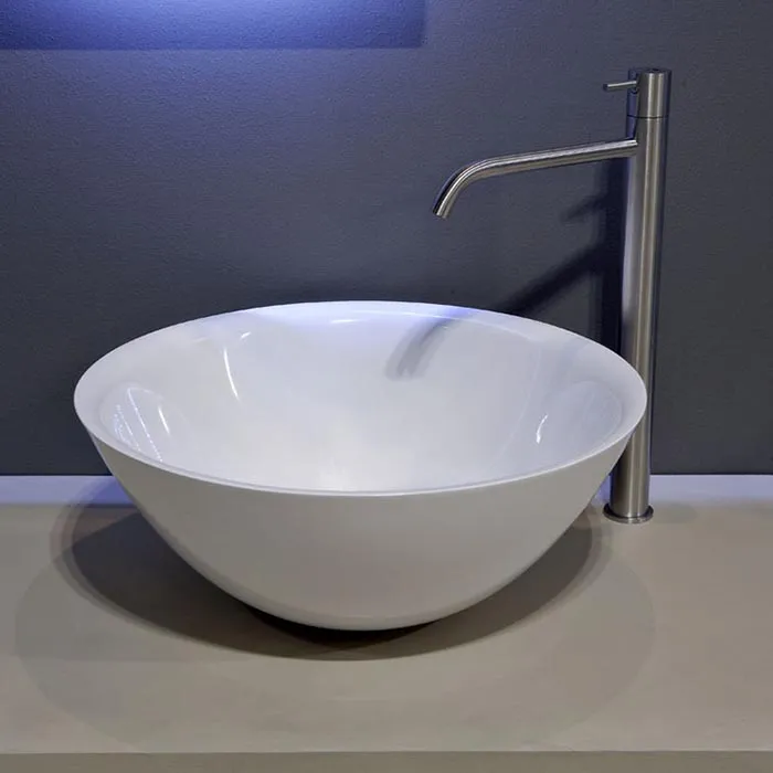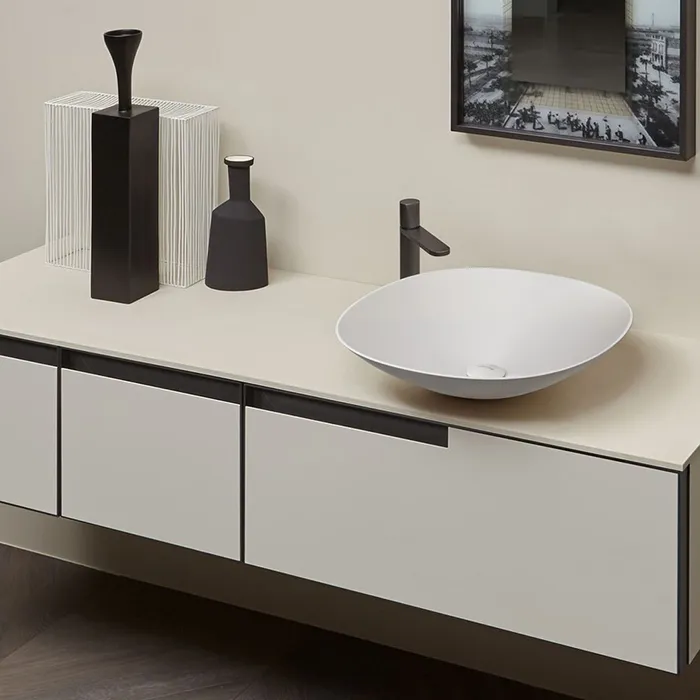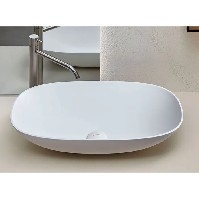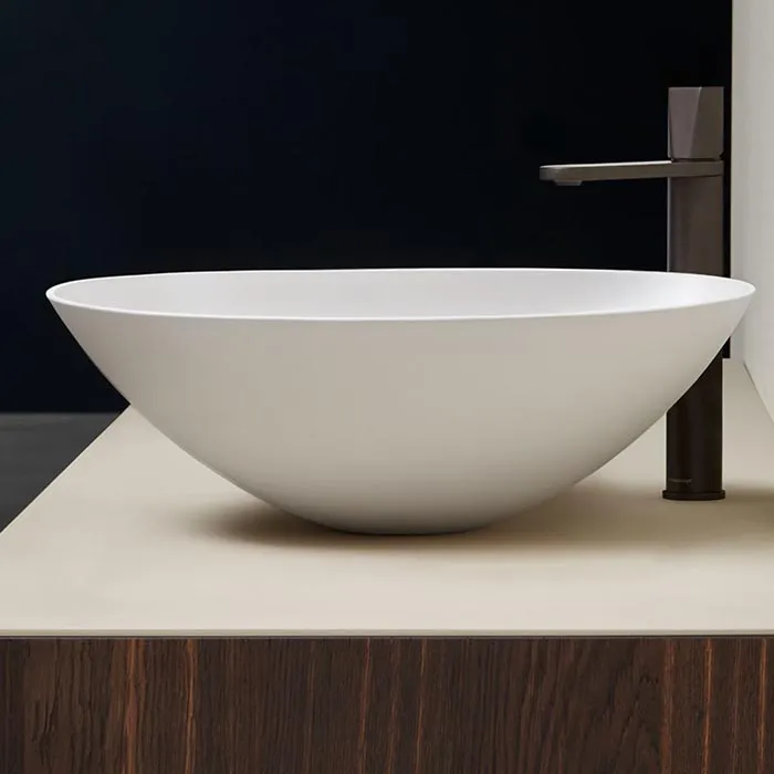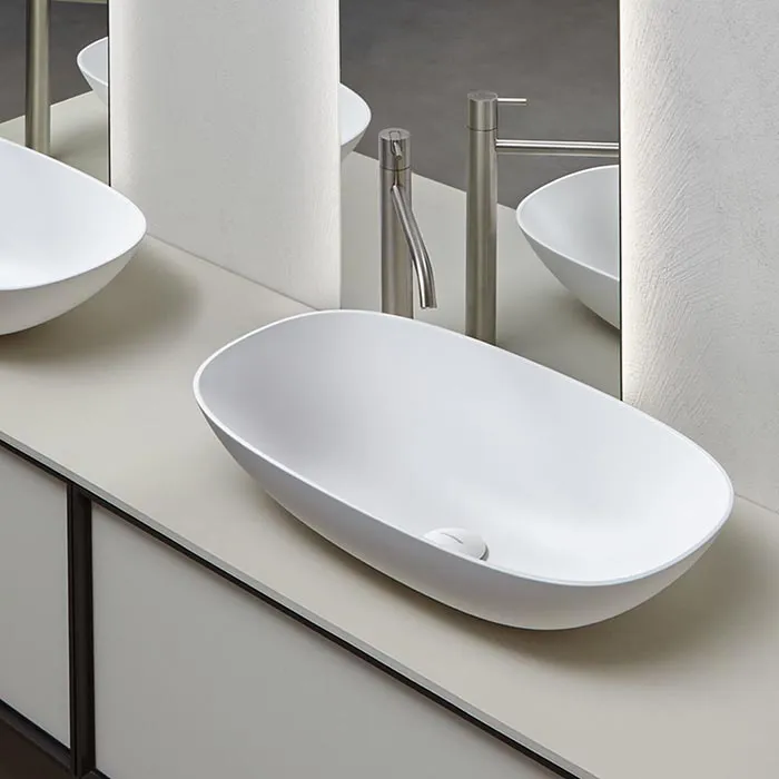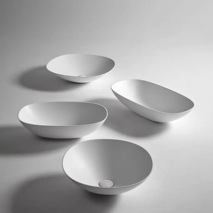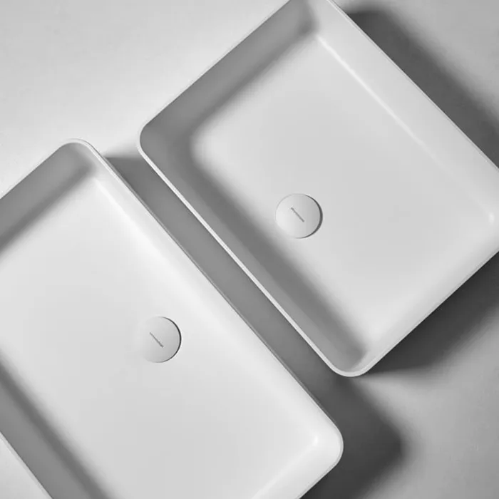 Учитывая оригинальную концепцию, геометрию и размеры серии, толщина краев составляет 5 мм, что придает большую легкость всему изделию и в то же время обеспечивает больший объем раковины. Типичные круглые и овальные формы остаются неизменными с очень узким основанием для опоры и более широкой чашей, в то время как прямоугольная версия с закругленными углами имеет идеально перпендикулярный объем.