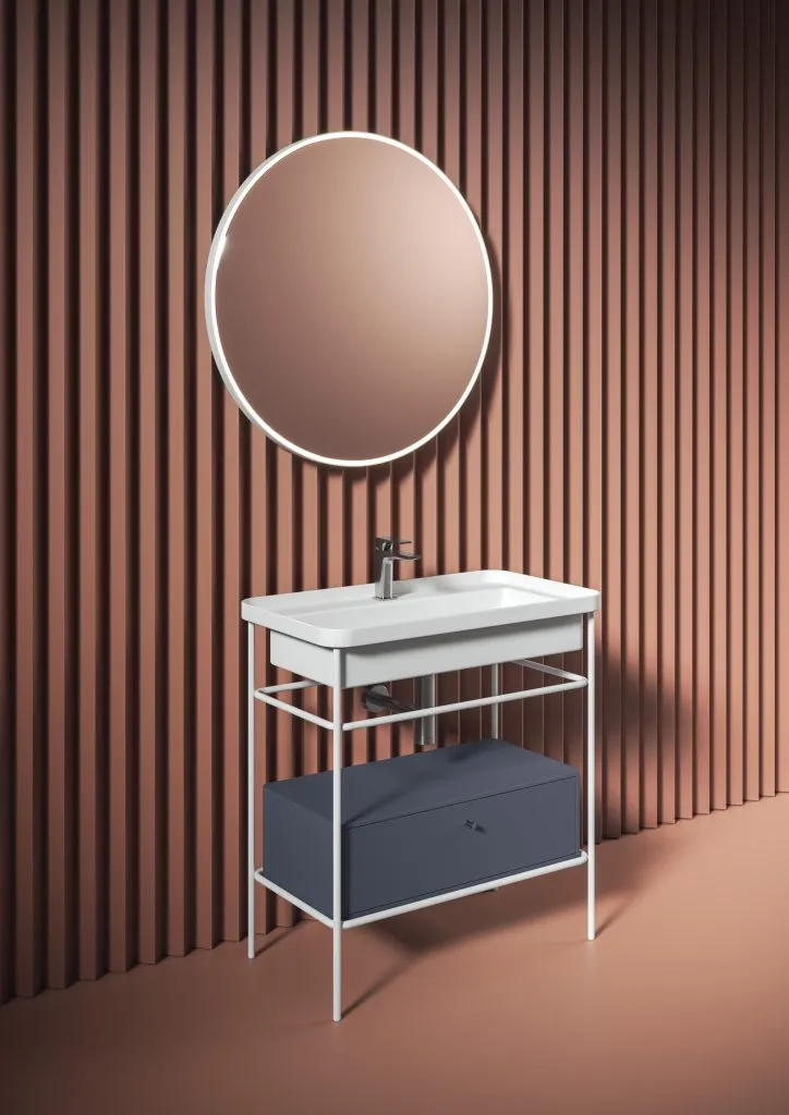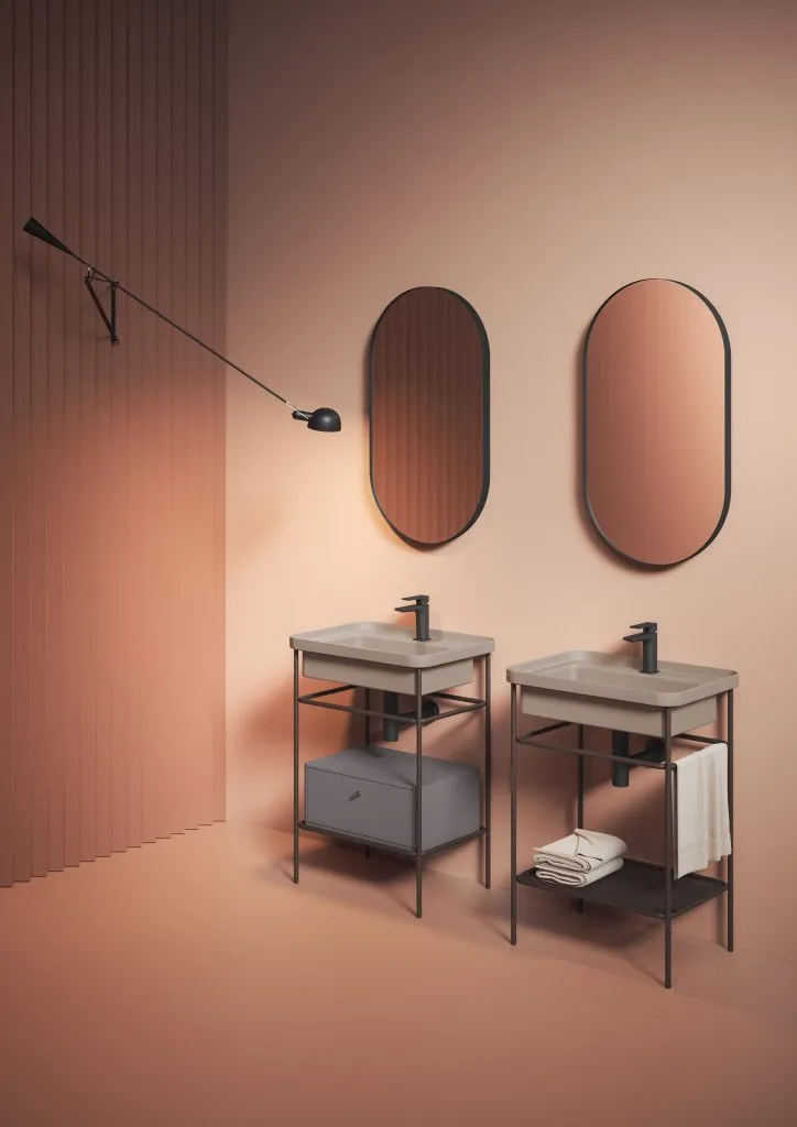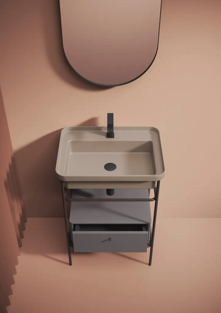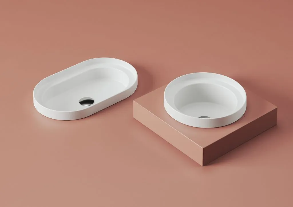 Раковины коллекции Fuori Scala от Artceram благодаря очень тонкому бортику могут устанавливаться тремя различными способами: они могут устанавливаться как накладные раковины – символически похожие на кастрюлю для приготовления пищи – или как встраиваемые раковины в столешницу мебели для ванной комнаты, где подчеркивается тонкий бортик; или монтироваться на специальные металлические ножки. структуры.