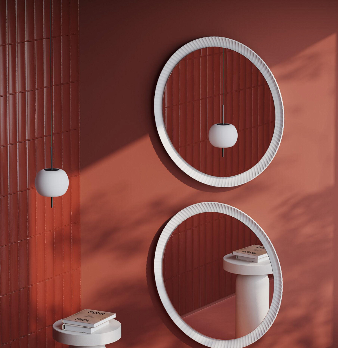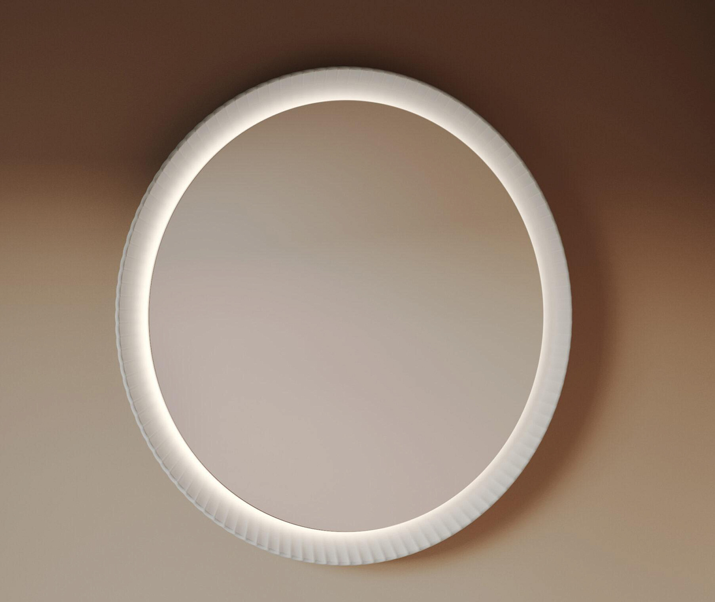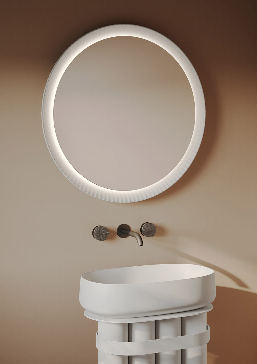 Зеркало намеренно выполнено в виде цельнокруглой формы, как и традиционная посуда, и эта “черта единства” позволила создать легкий волнистый декор, начинающийся от центра зеркала и расширяющийся, достигая своего максимального выражения в верхней части круга. Этот жест, этот переход усиливаются при включенной подсветке, которая подчеркивает волнистые черты лица за счет интересной игры света и тени