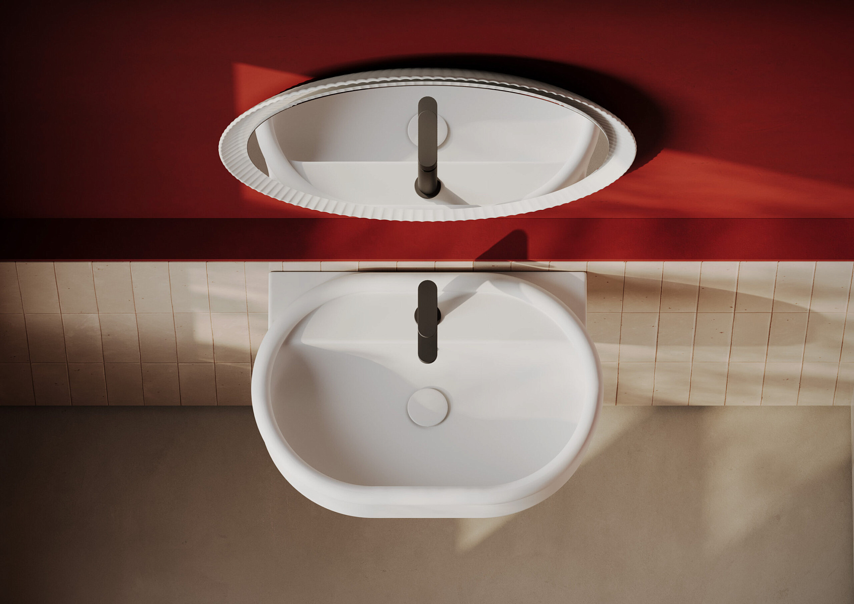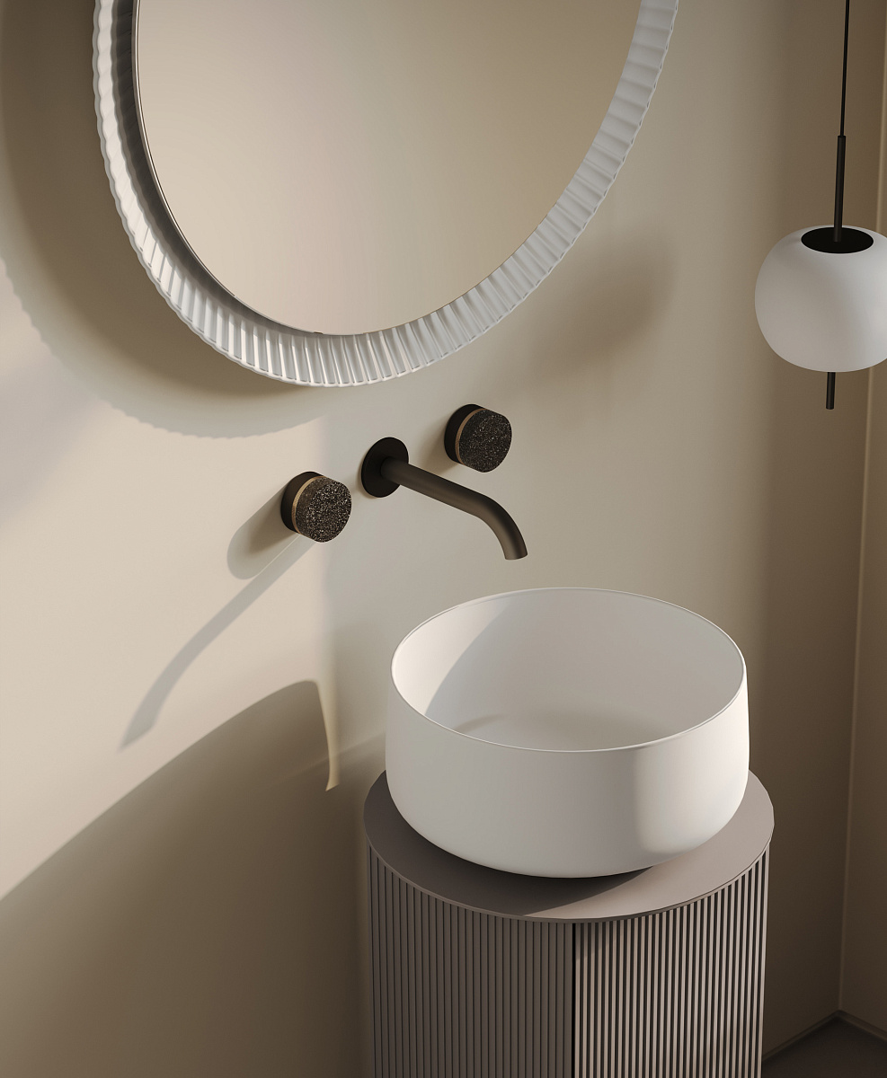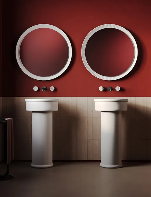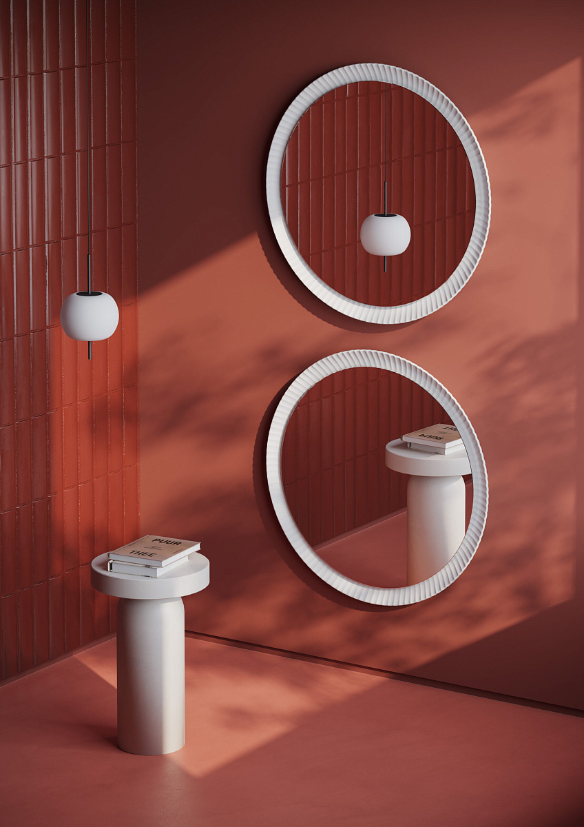 Зеркало намеренно выполнено в виде цельнокруглой формы, как и традиционная посуда, и эта “черта единства” позволила создать легкий волнистый декор, начинающийся от центра зеркала и расширяющийся, достигая своего максимального выражения в верхней части круга. Этот жест, этот переход усиливаются при включенной подсветке, которая подчеркивает волнистые черты лица за счет интересной игры света и тени
