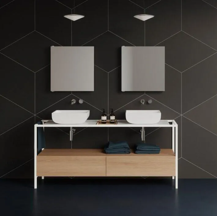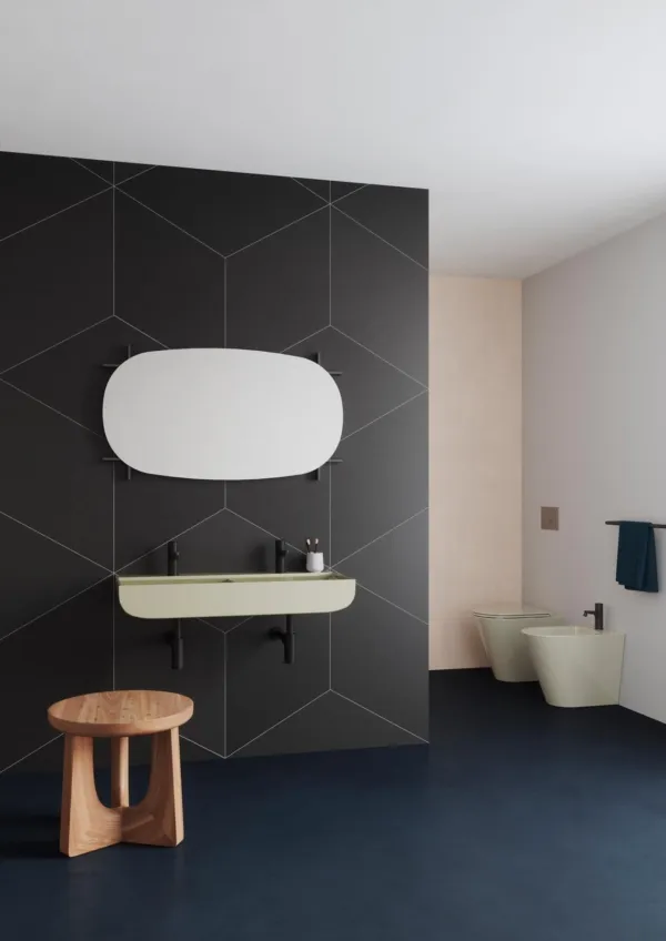 Раковина коллекции Leuca, как одиночная, так и двойная, вдохновлена дизайном волны и имеет волнистые линии и острые края, придавая динамизм керамической материи, гладкой и однородной.