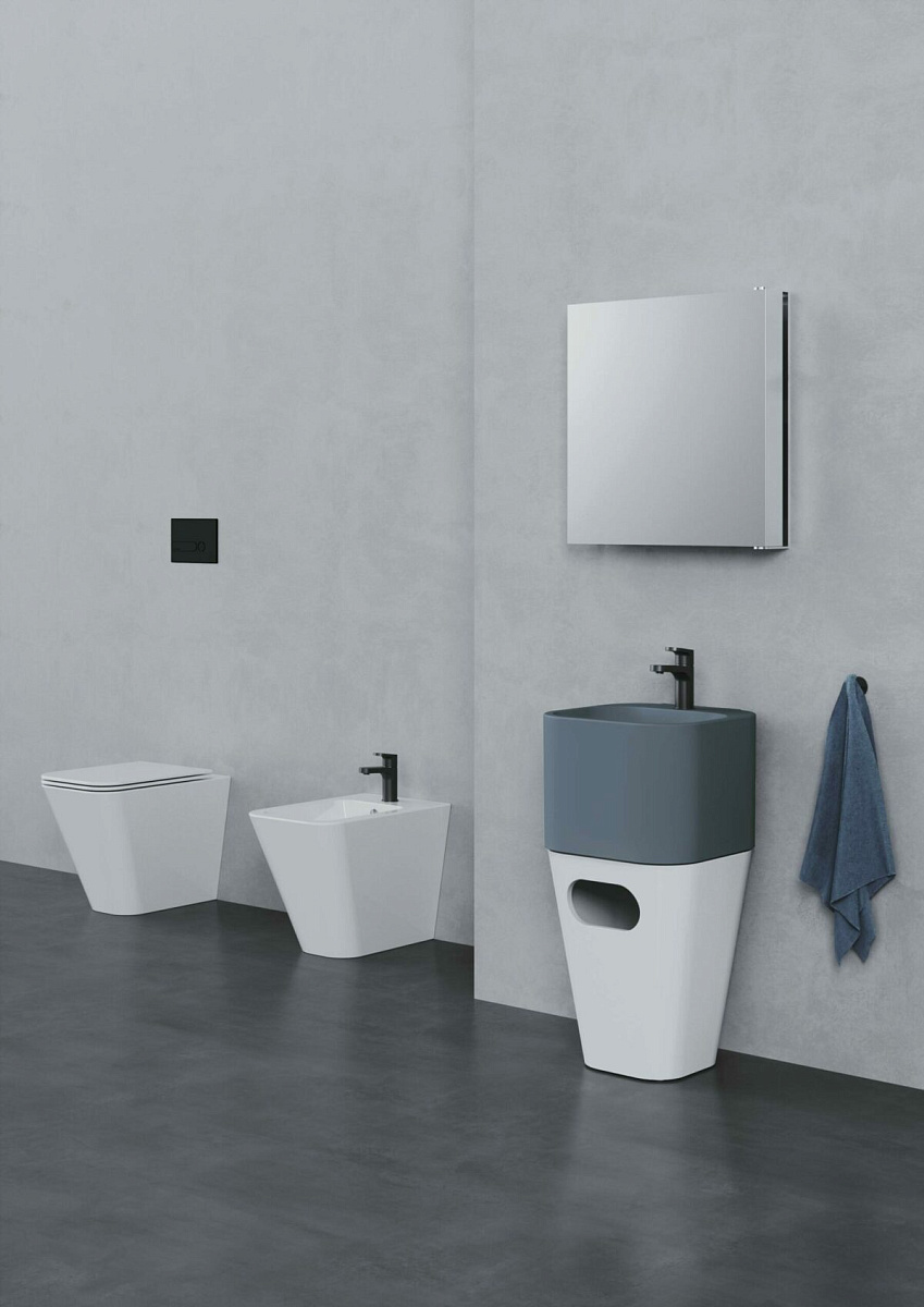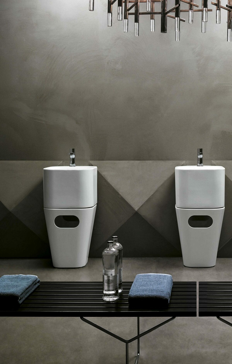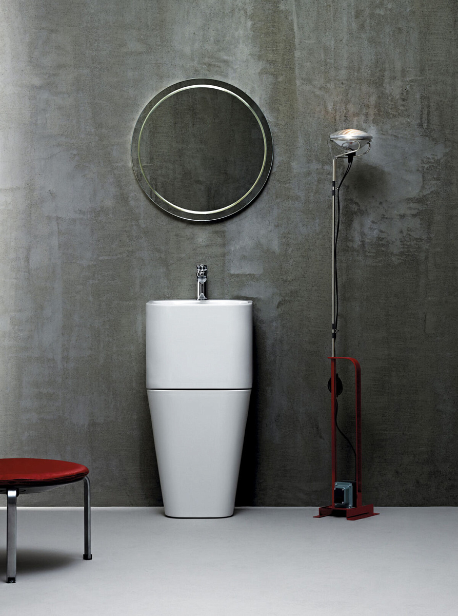 Парящий между подвесным умывальником и раковиной с колонной коллекция Tandem, проект Паоло Ульяна входит в ванную комнату.