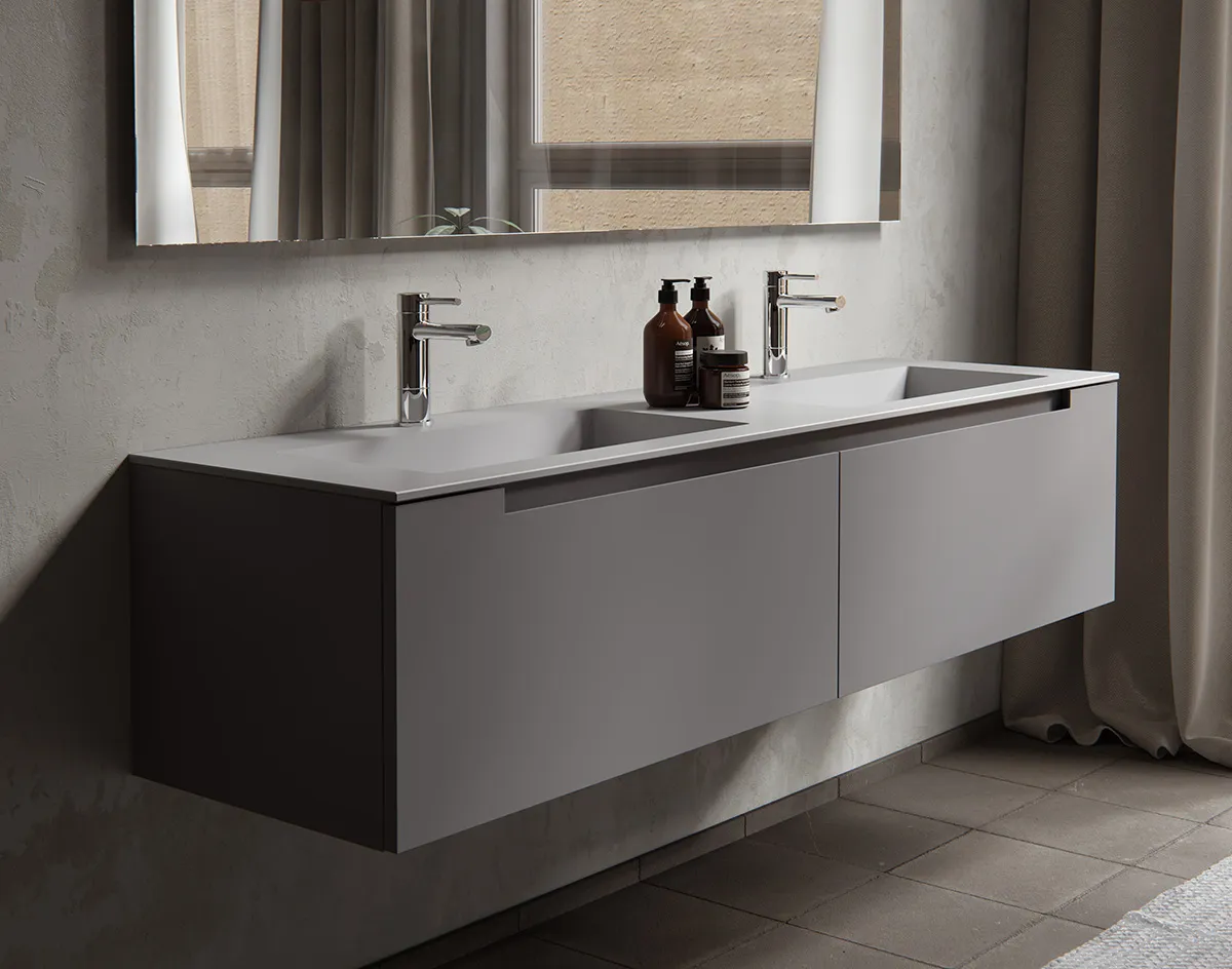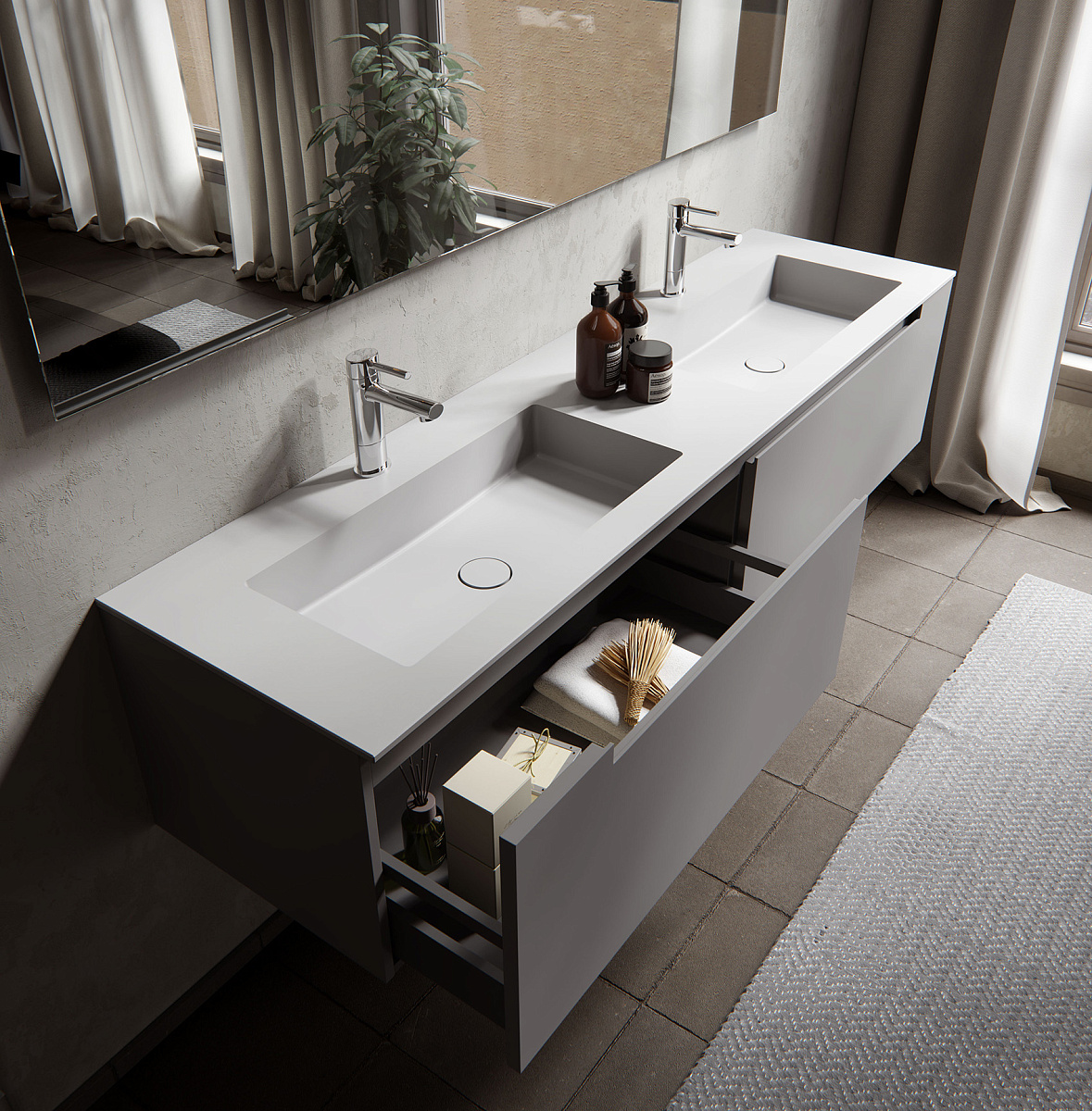 Внешние поверхности тумб и пеналов Simple облицованы эмалью или натуральным шпоном. Столешницы из керамогранита, большой выбор матовых и глянцевых поверхностей. Фасады могут выполнены из фрезерованных деревянных панелей или крашенного фрезерованного МДФ. .Внутренняя отделка