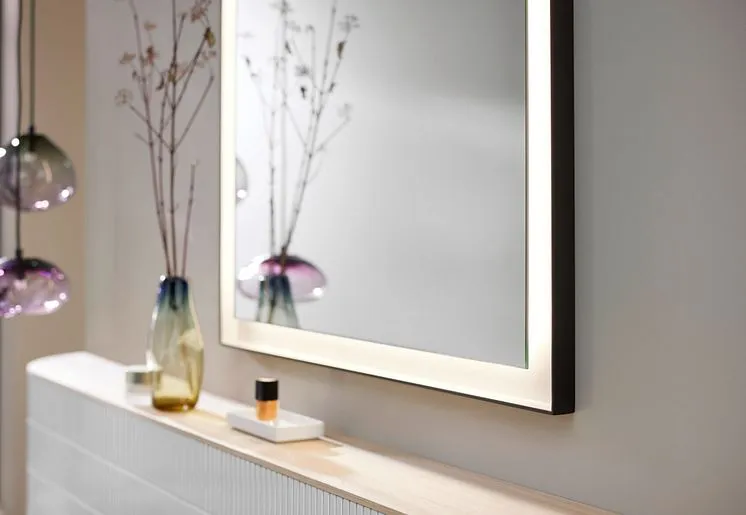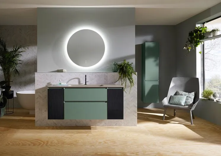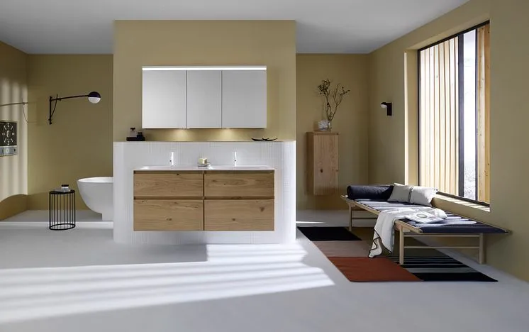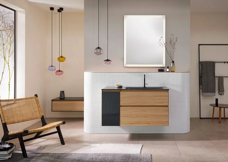 Корпуса и фасады, обработанные под углом, с высококачественной отделкой лаком и шпоном из новой коллекции Accura от Burgbad демонстрируют безупречный дизайн без ручек и излишеств.