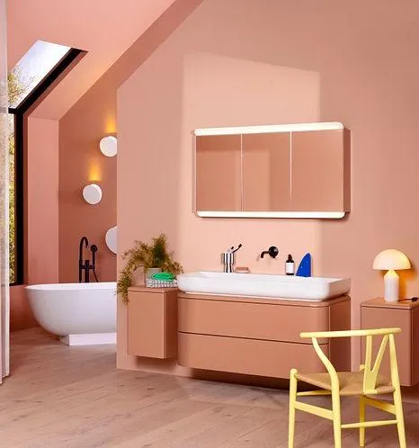 Теплые оттенки с мягкими краями: Шкафы новой коллекции B: me от Burgbad с высококачественными лакированными поверхностями (можно выбрать глянцевые, матовые или ультра–матовые) и фасадами с закругленными краями можно комбинировать для создания высокого шкафа и сделать его двухцветным -  в эксклюзивном сочетании яркого трендового цвета песчаника и желаемого бежево-красного цвета для особенно гармоничная и теплая терракотовая атмосфера. Верхний более светлый оттенок делает его таким же воздушным.
