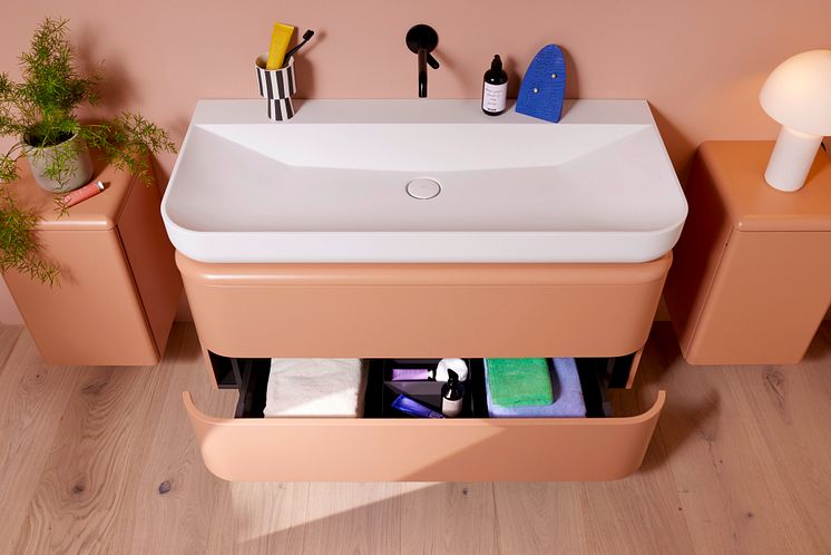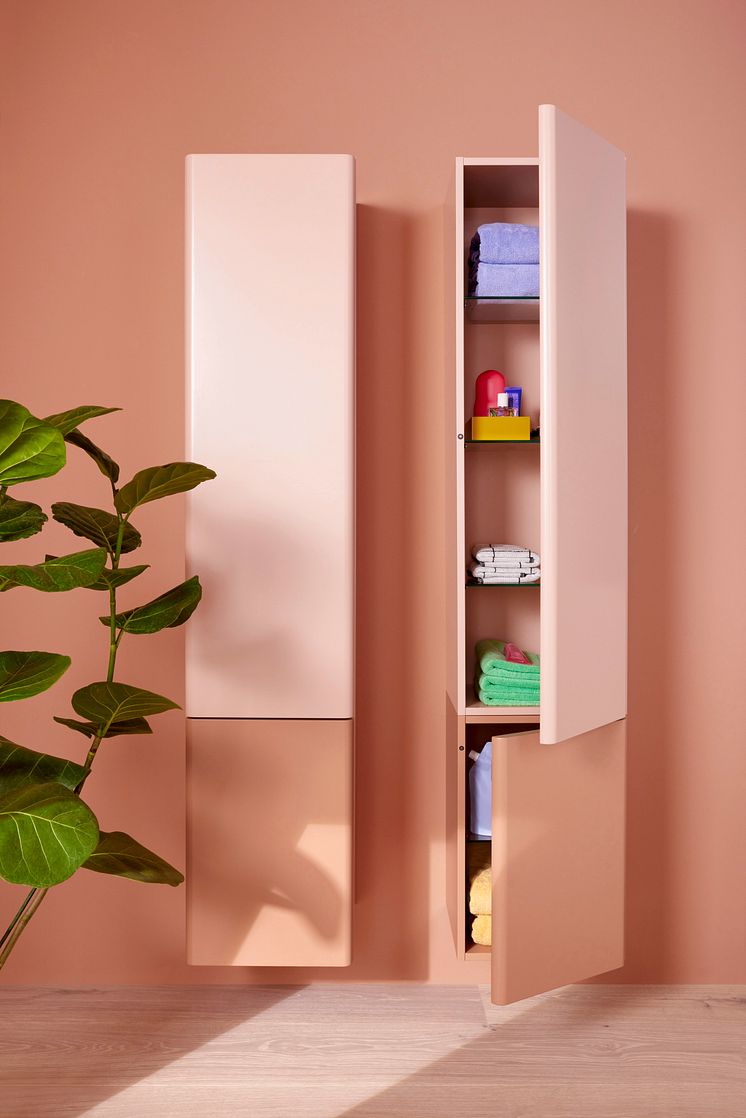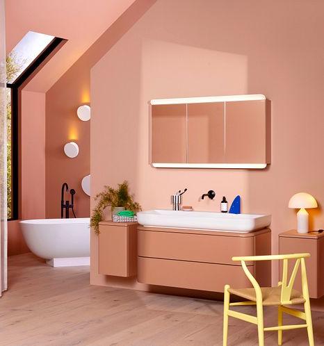 Теплые оттенки с мягкими краями: Шкафы новой коллекции B: me от Burgbad с высококачественными лакированными поверхностями (можно выбрать глянцевые, матовые или ультра–матовые) и фасадами с закругленными краями можно комбинировать для создания высокого шкафа и сделать его двухцветным - в эксклюзивном сочетании яркого трендового цвета песчаника и желаемого бежево-красного цвета для особенно гармоничная и теплая терракотовая атмосфера. Верхний более светлый оттенок делает его таким же воздушным.