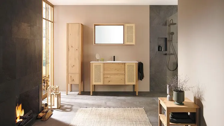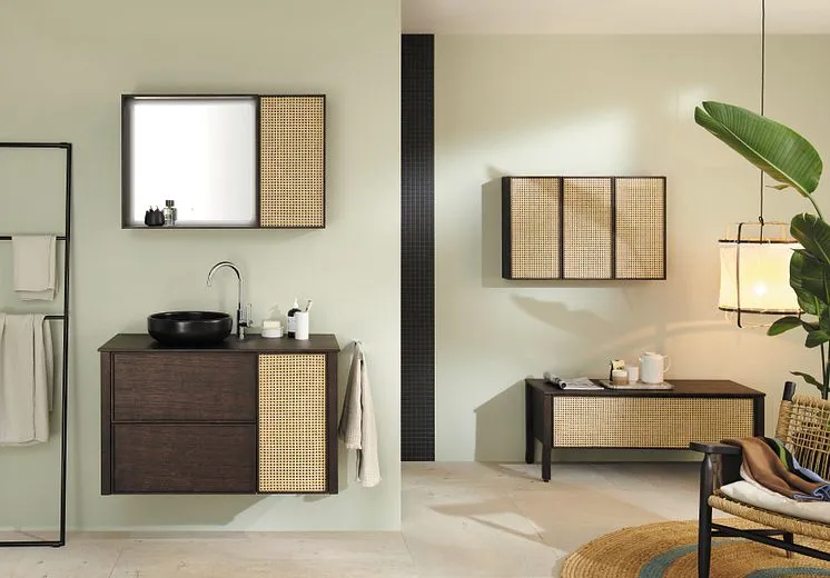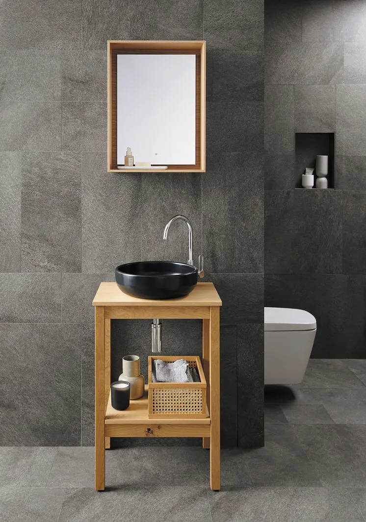 Оригинальное, классическое и современное: решение для гостевой ванной комнаты из новой коллекции Max от Burgbad из натурального дерева с керамическим верхним умывальником белого или черного матового цвета.