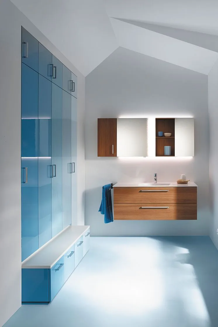 Индивидуально разработанное разнообразие цветов и пространство для хранения, адаптированное к архитектуре, можно планировать с помощью лакокрасочных поверхностей и гибких шкафов, разработанных в рамках системной программы Burgbad Sys30.