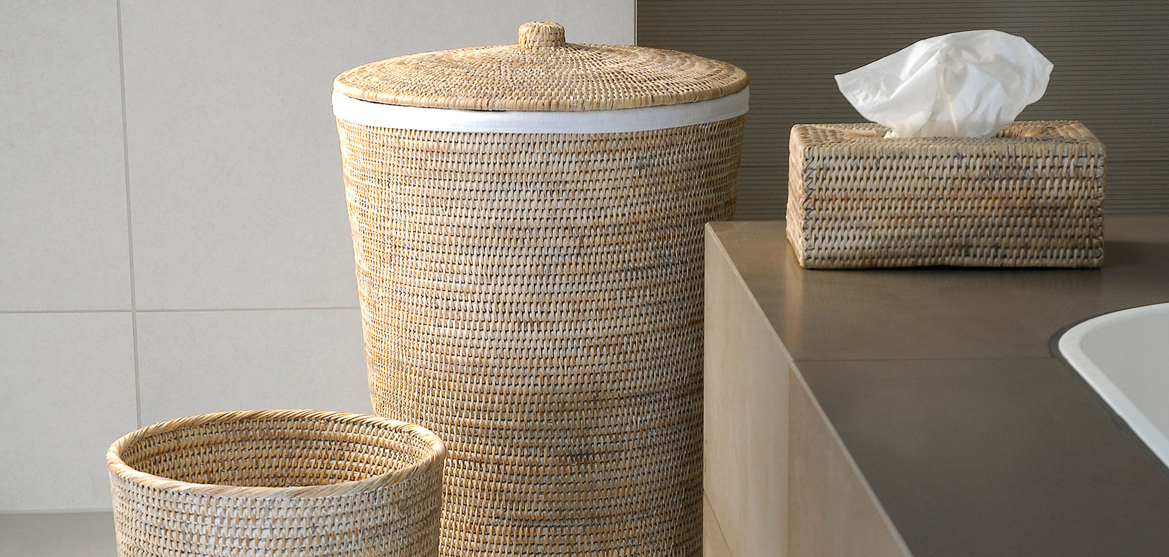 Плетеные вручную аксессуары коллекции Basket от Decor Walther создают природные акценты в интерьере ванной комнаты.