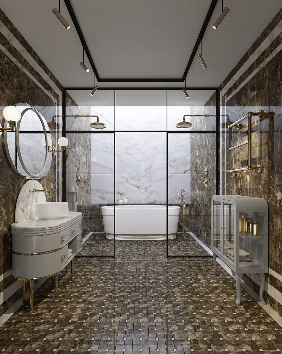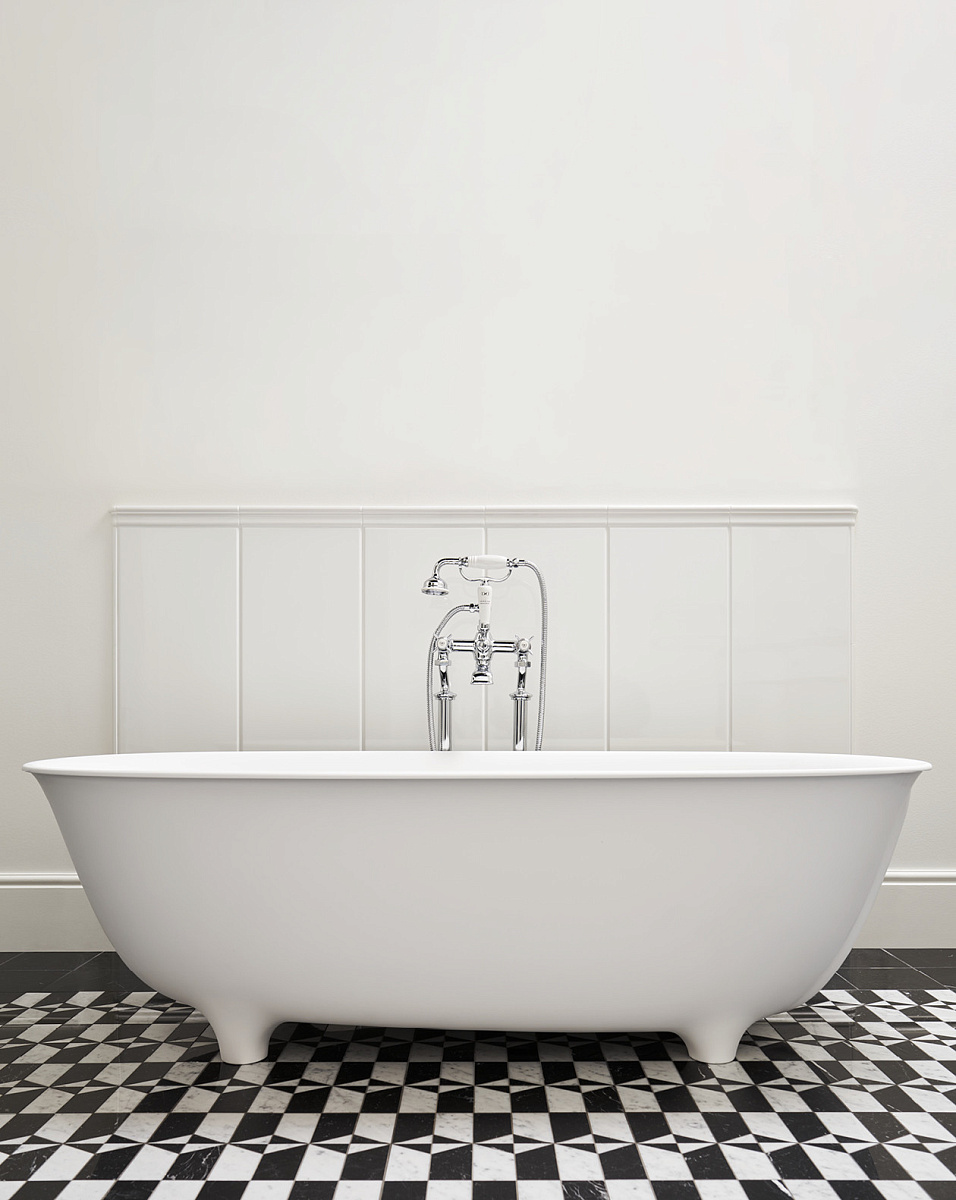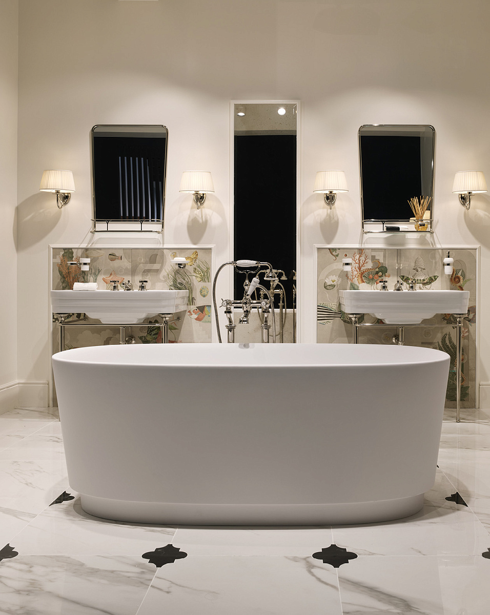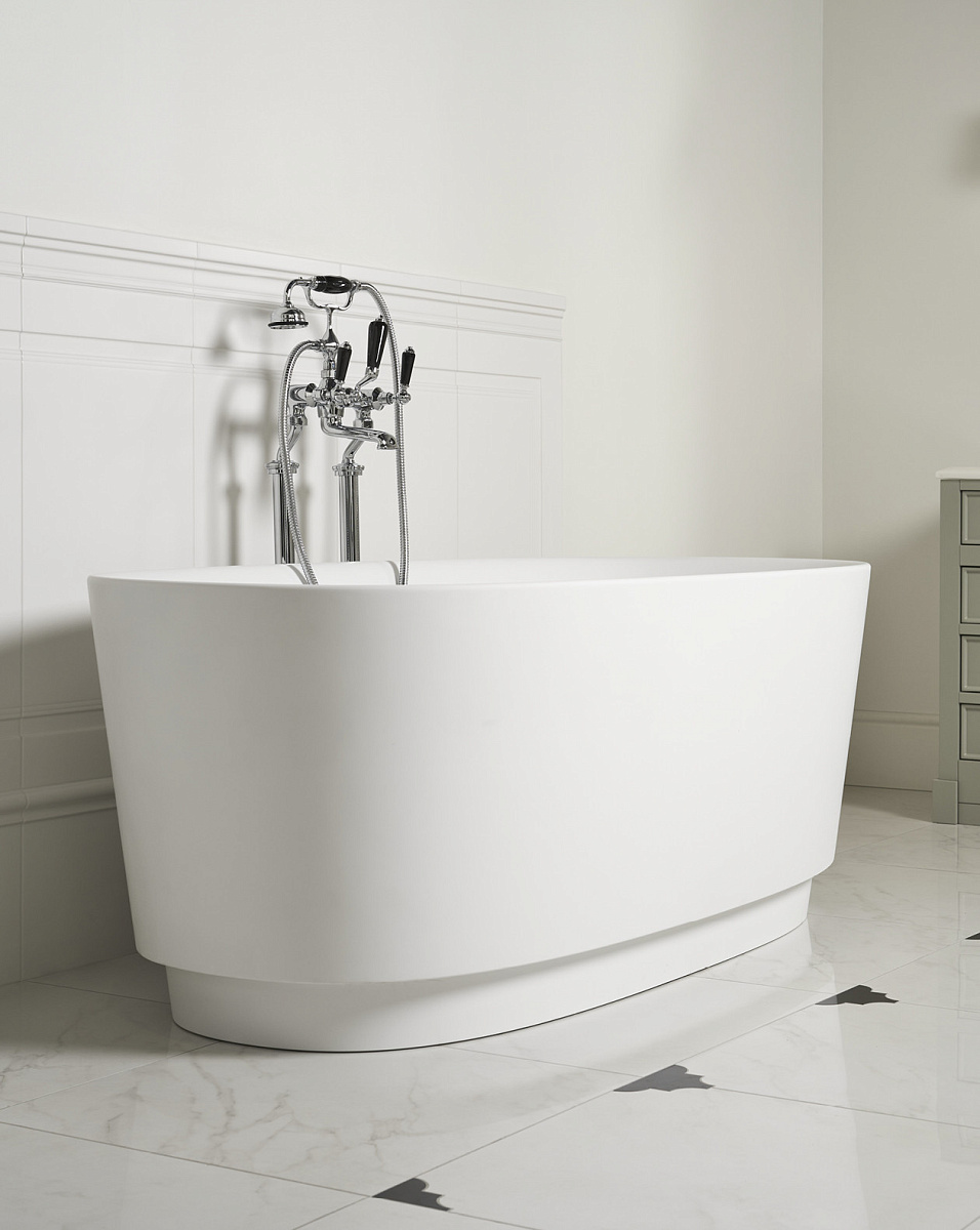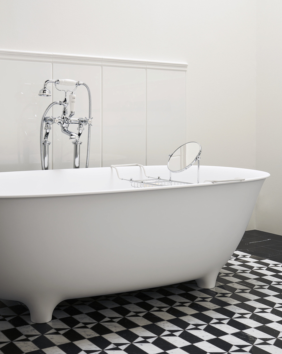 Ее лаконичный дизайн, навеянный американским направлением течения "стримлайн модерн" стиля ар-деко и основанный на тщательно продуманной игре безупречного соединения различных конструкционных элементов, дополнен такими утонченными деталями, как белый цоколь, который по запросу может быть облицован благородным мрамором Калакатта в вариантах "золотистый", "натуральный" и "калеванный". Изделие отлично сочетается со всеми коллекциями смесителей Devon&Devon.