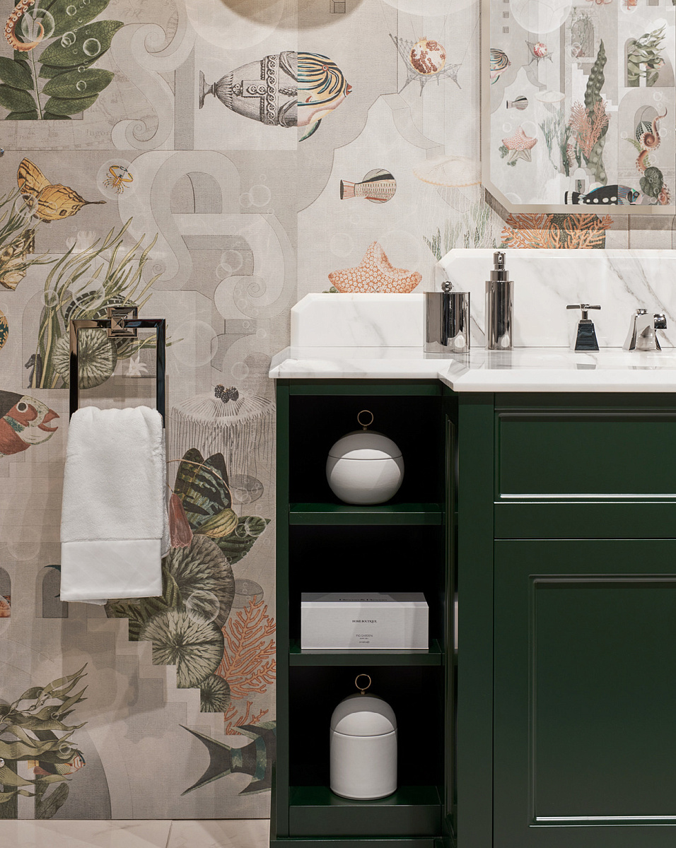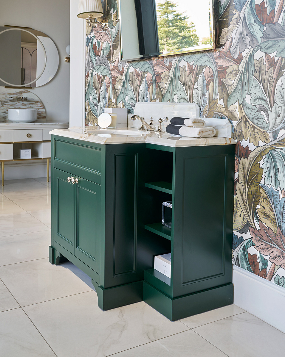 Ее лаконичный дизайн воплощает в себе неподвластную времени красоту неоклассического стиля. Мраморная столешница и бортик, латунные ручки и конструкция из окрашенного дерева предлагаются с возможностью персонализации цветового исполнения и отделки по требованию заказчика.