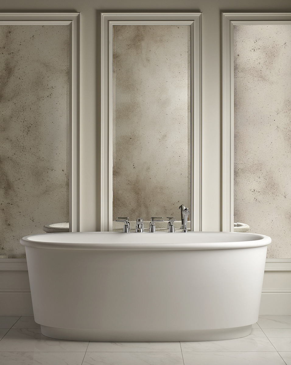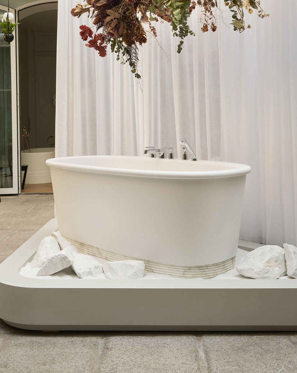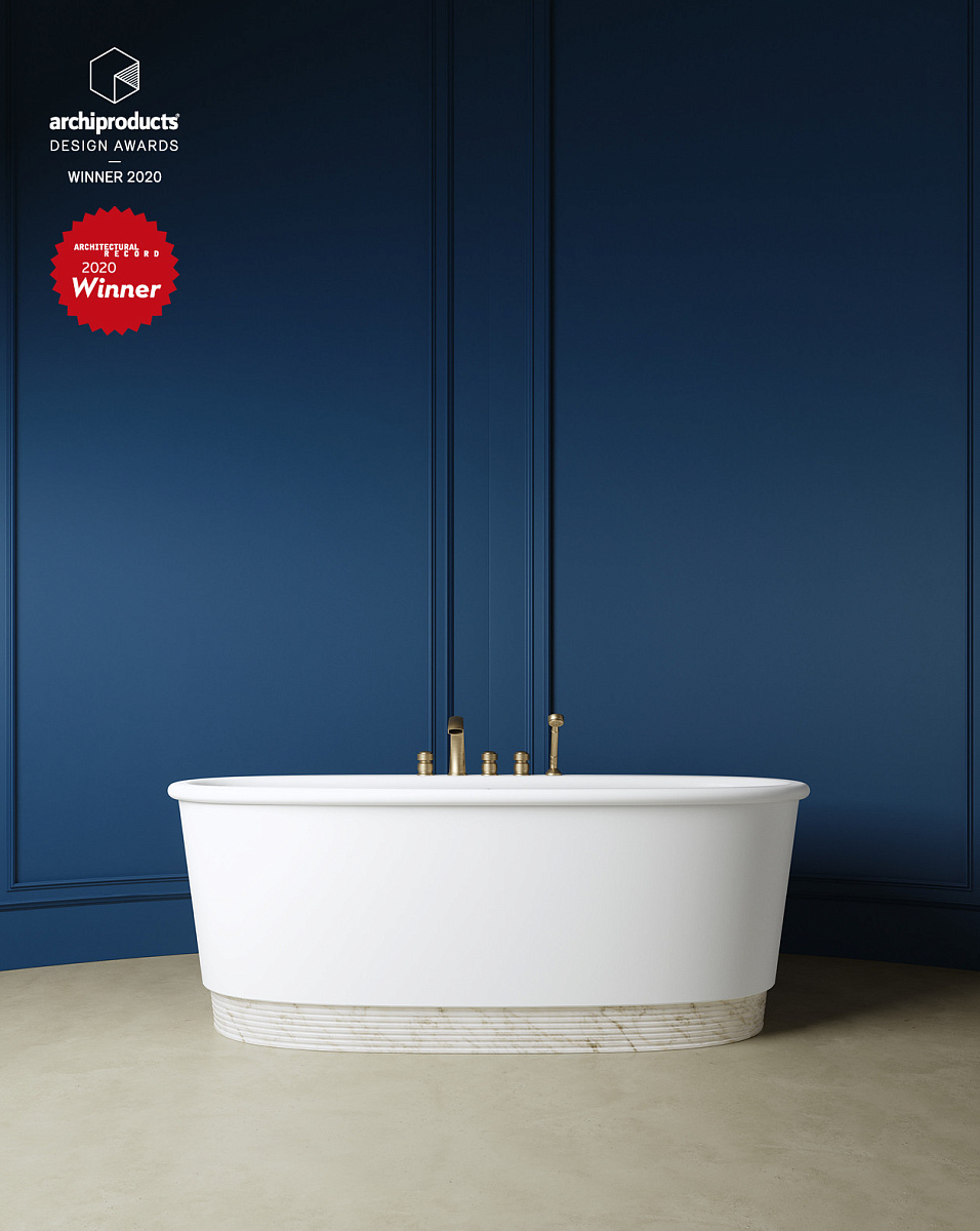 Дизайн ванны, в основе которого лежит тщательно продуманная игра безупречного соединения различных конструкционных элементов, олицетворяет современный взгляд на изысканные веяния ар-деко, дополненный такими утонченными деталями, как сдержанный белый цоколь, который по запросу может быть облицован благородным мрамором Калакатта в вариантах "золотистый", "натуральный" и "калеванный".