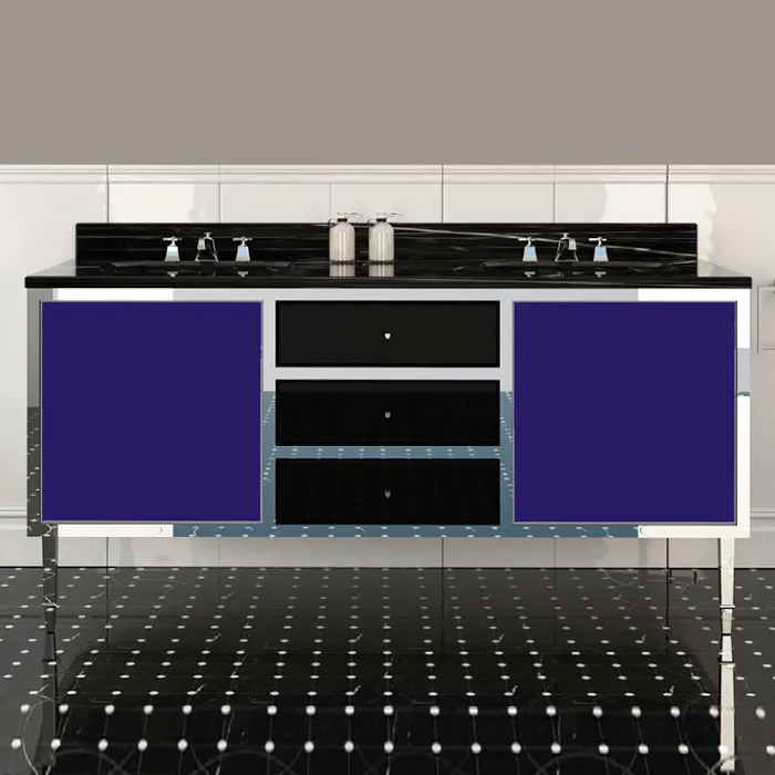 Простой и квадратной формы дизайн выделяется двумя большими створками и комодом из лакированного дерева контрастных цветов.