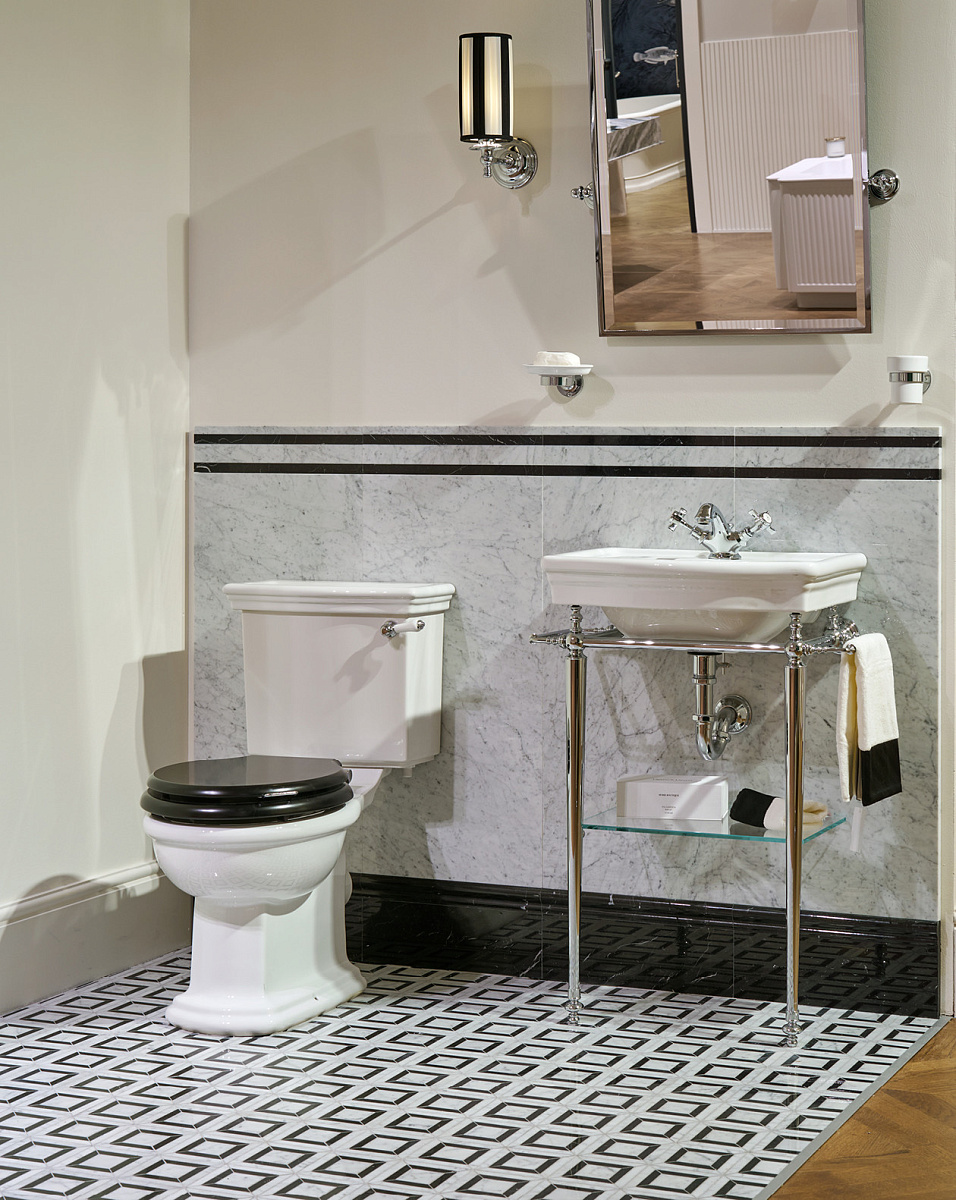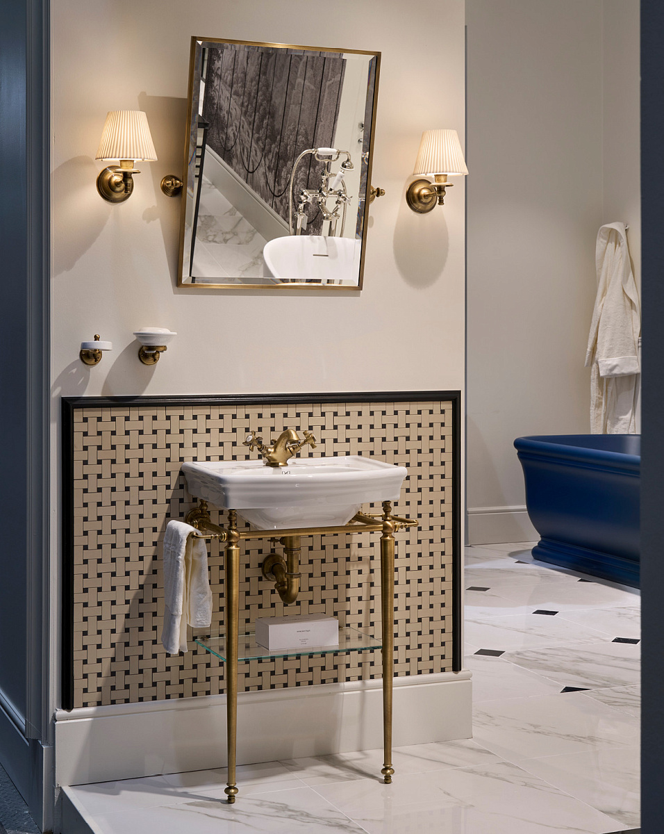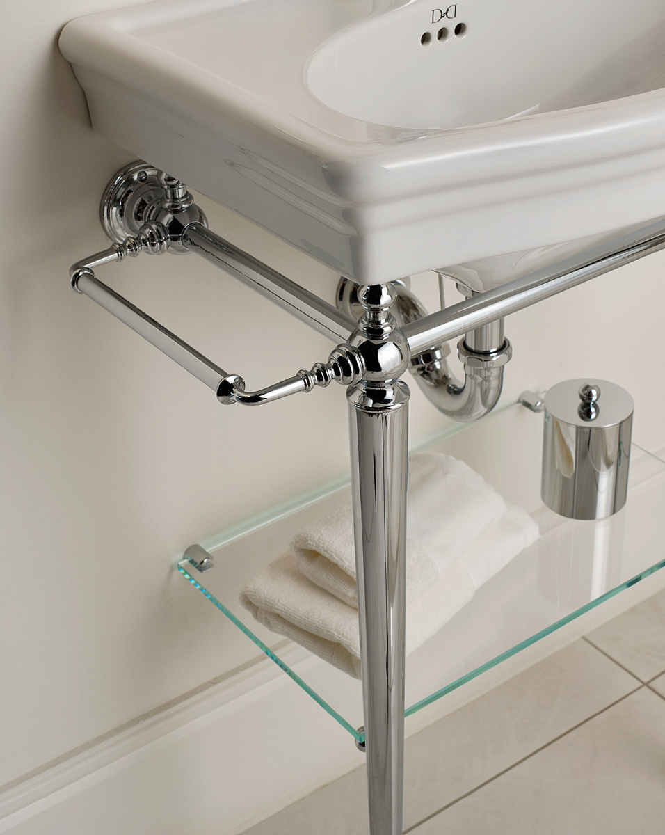 Латунная конструкция, доступная в нескольких вариантах отделки, включает в себя две вешалки для полотенец сбоку, стеклянную полку и раковину в классическом стиле из лучшего английского фарфора.