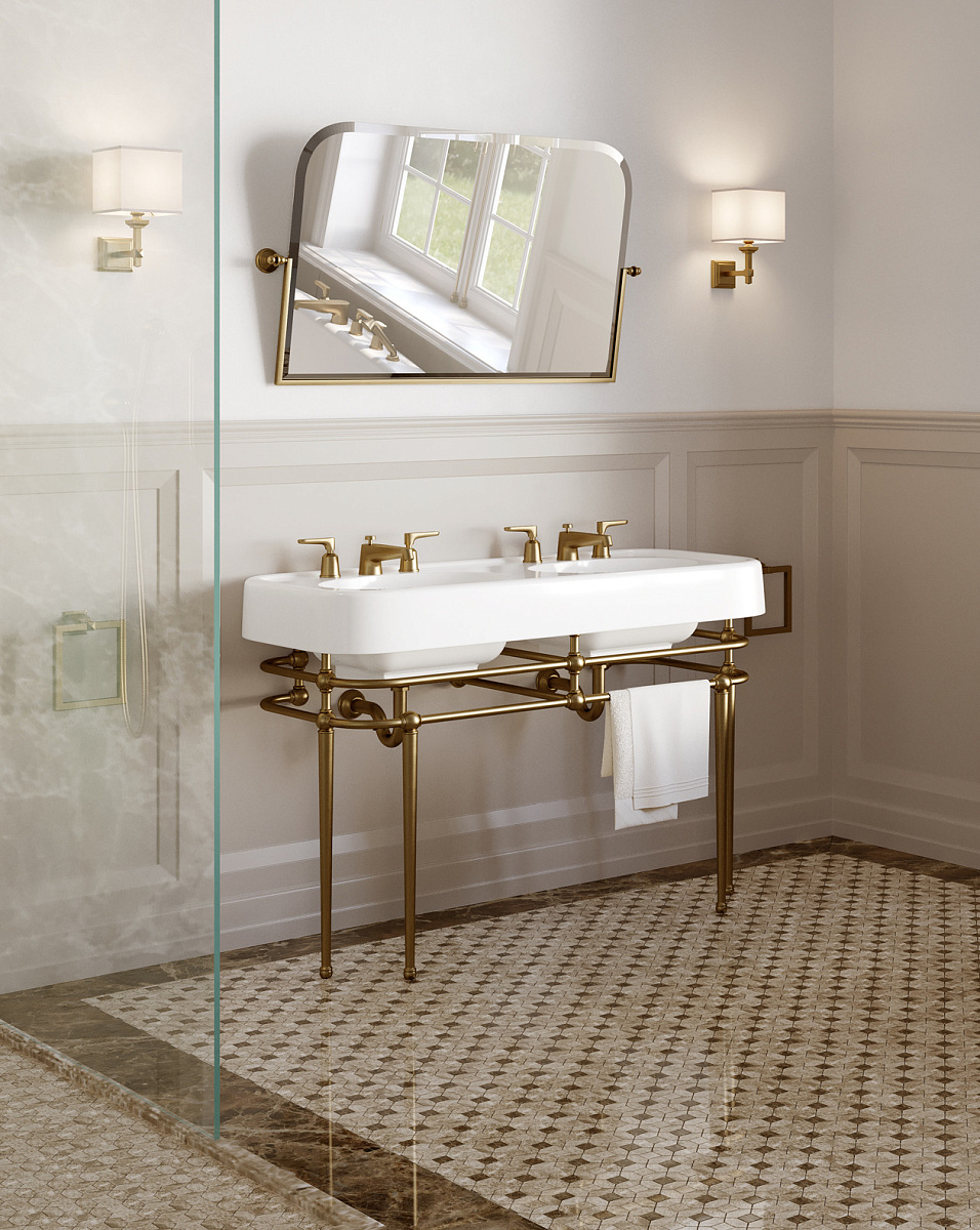 Несущая конструкция выполнена из трубчатых элементов из точеной латуни, доступна в хромированной, светло-золотой, полированной никелевой или белой отделке.
