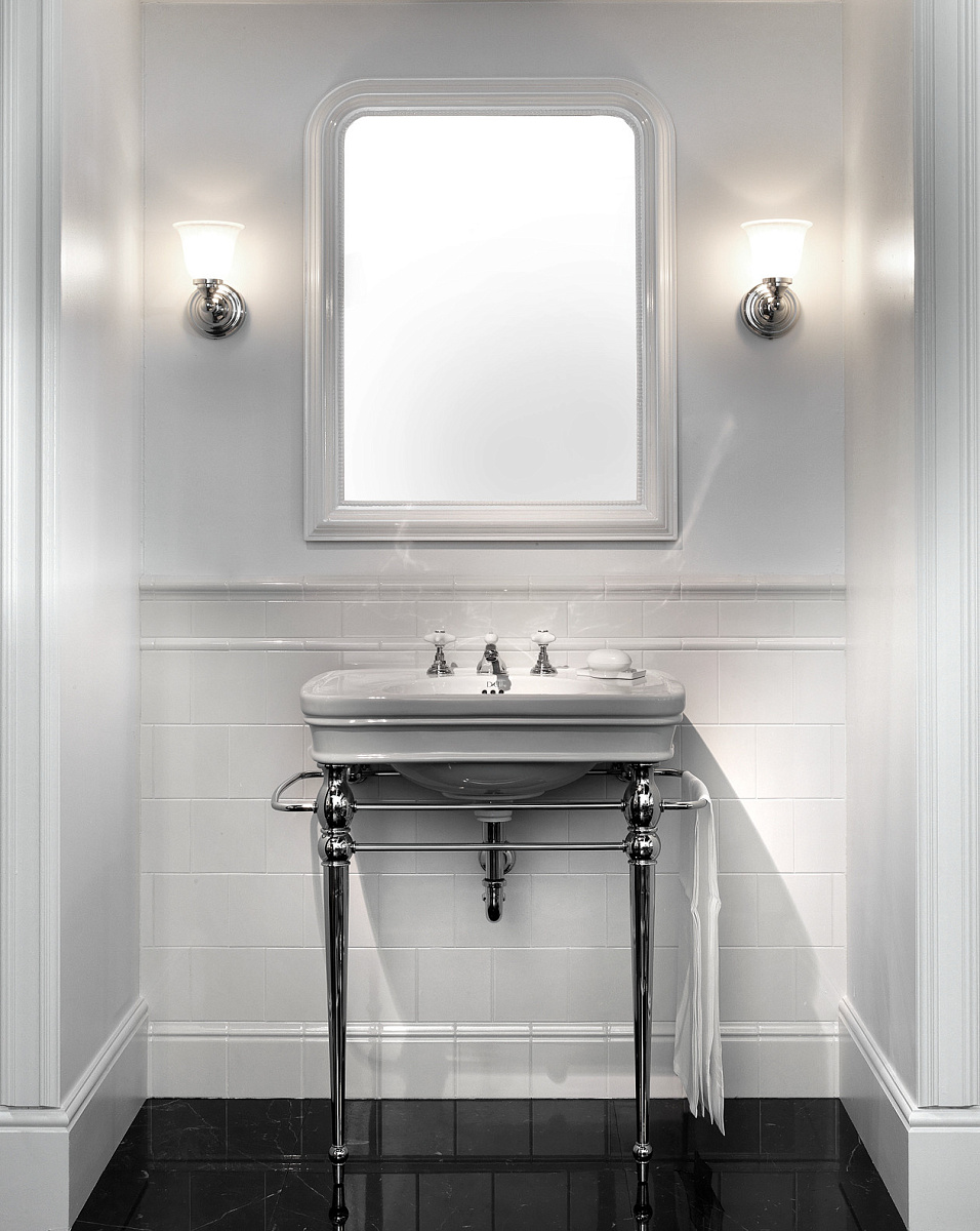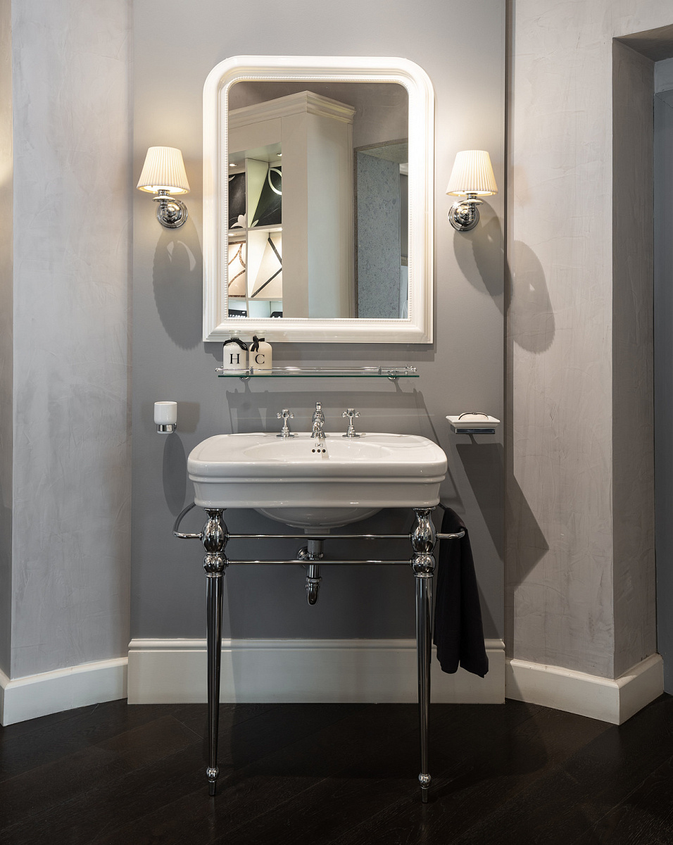 Эклектичная консоль, в которой с удивительной гармонией сочетаются классическое вдохновение и утонченная атмосфера лучшего дизайна пятидесятых. Несущая конструкция из алюминия с точеными латунными элементами доступна в хромированной, светло-золотой или полированной никелевой отделке. Консоль дополняет одноименная фарфоровая раковина с большой поверхностью столешницы, и четыре удобных полотенцедержателя.