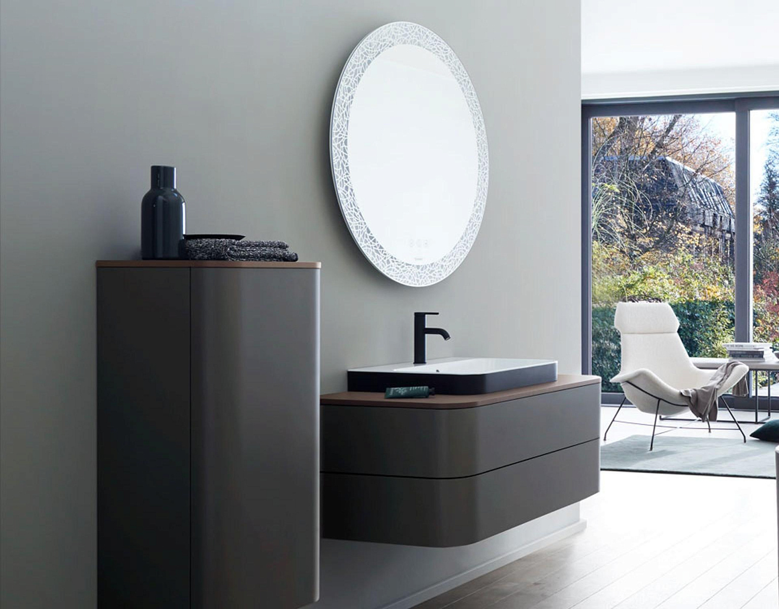 Для этой серии характерна архетипичная круглая дуга. Элегантные чаши для столешниц, одиночные консоли, подходящие к ним полувысокие тумбы и зеркала имеют округлую и четкую форму. В результате получилось современное продолжение классической коллекции Happy D.