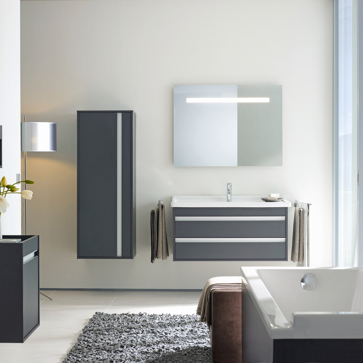 Особенно выделяются характерные ручки эргономичной формы, которые присутствуют во всей коллекции. Несмотря на минималистичный внешний вид, эта серия достаточно универсальна, чтобы вписаться в любой современный интерьер ванной комнаты.