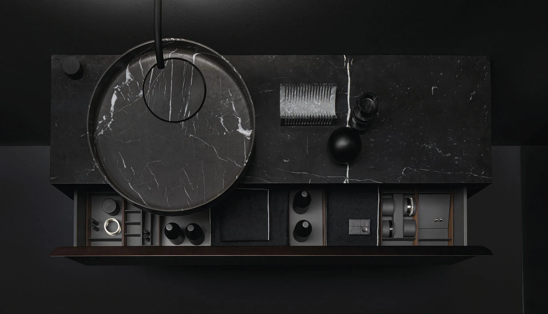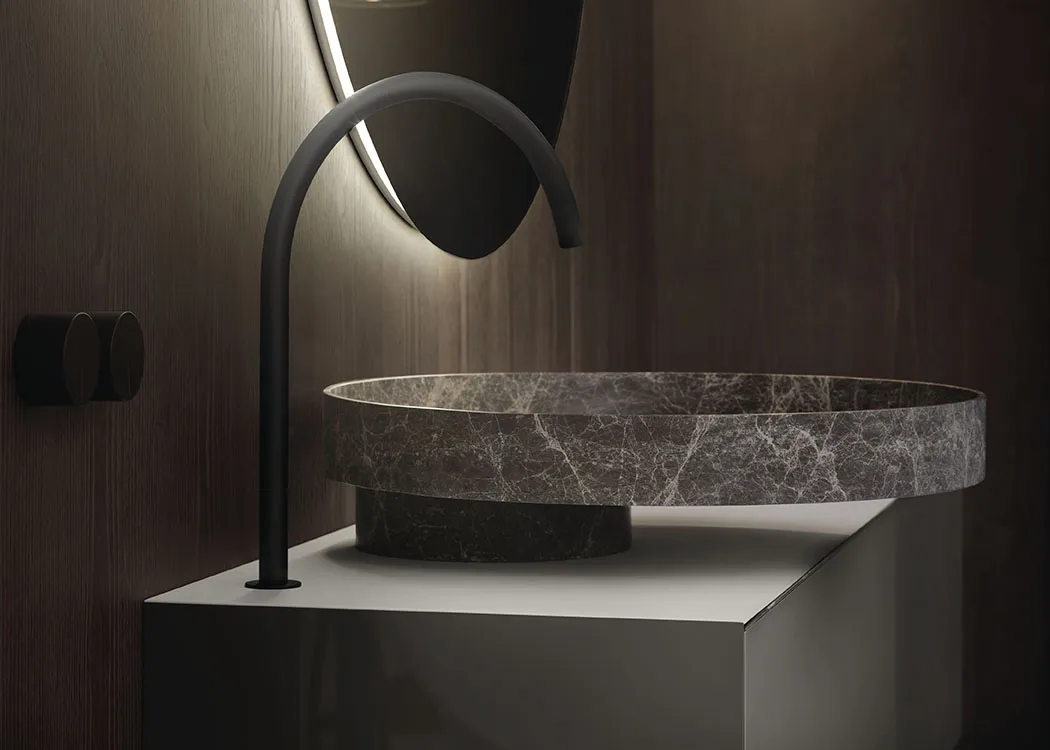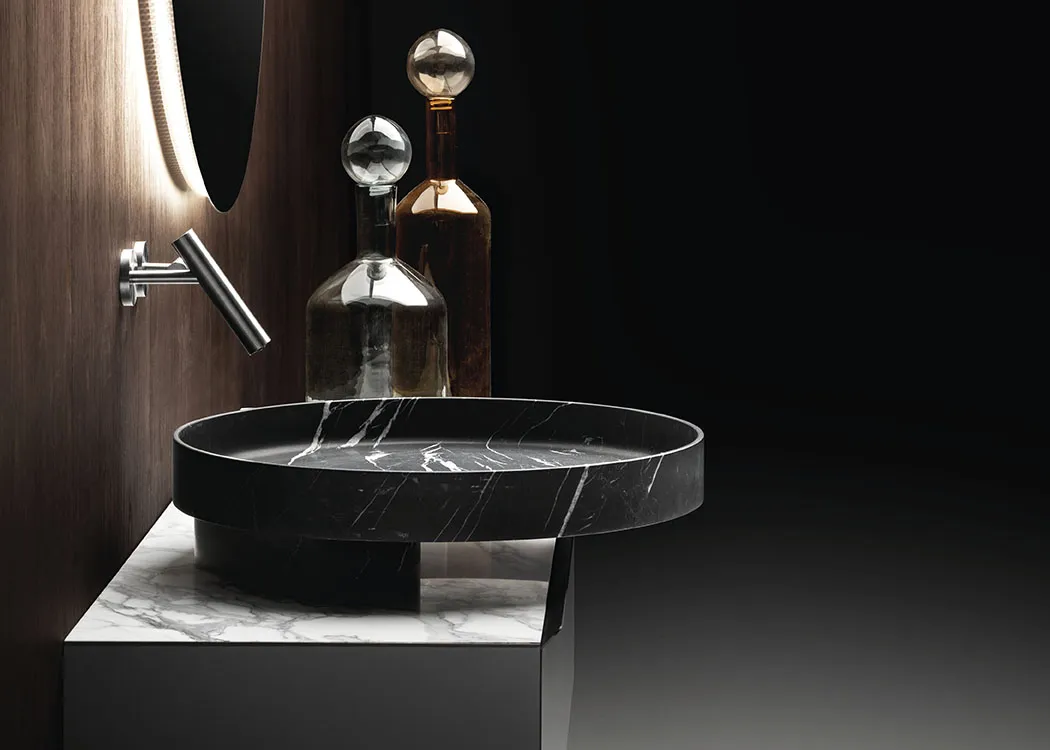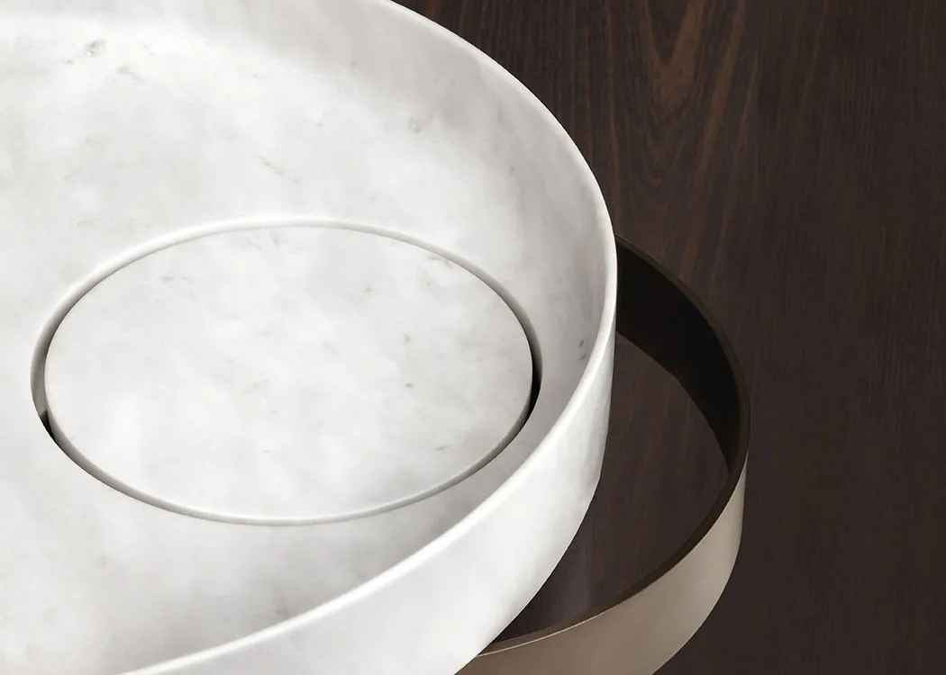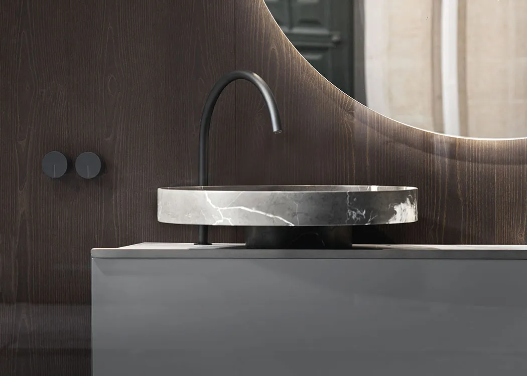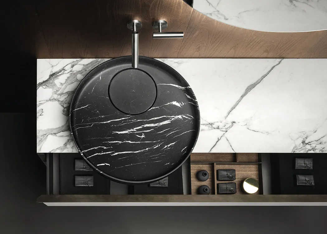 Столешницы и умывальники также могут быть выполнены из мрамора в сочетании с полированными и матовыми лакированными деревянными фасадами для создания изысканных, личных и эксклюзивных цветовых и текстурных сочетаний.