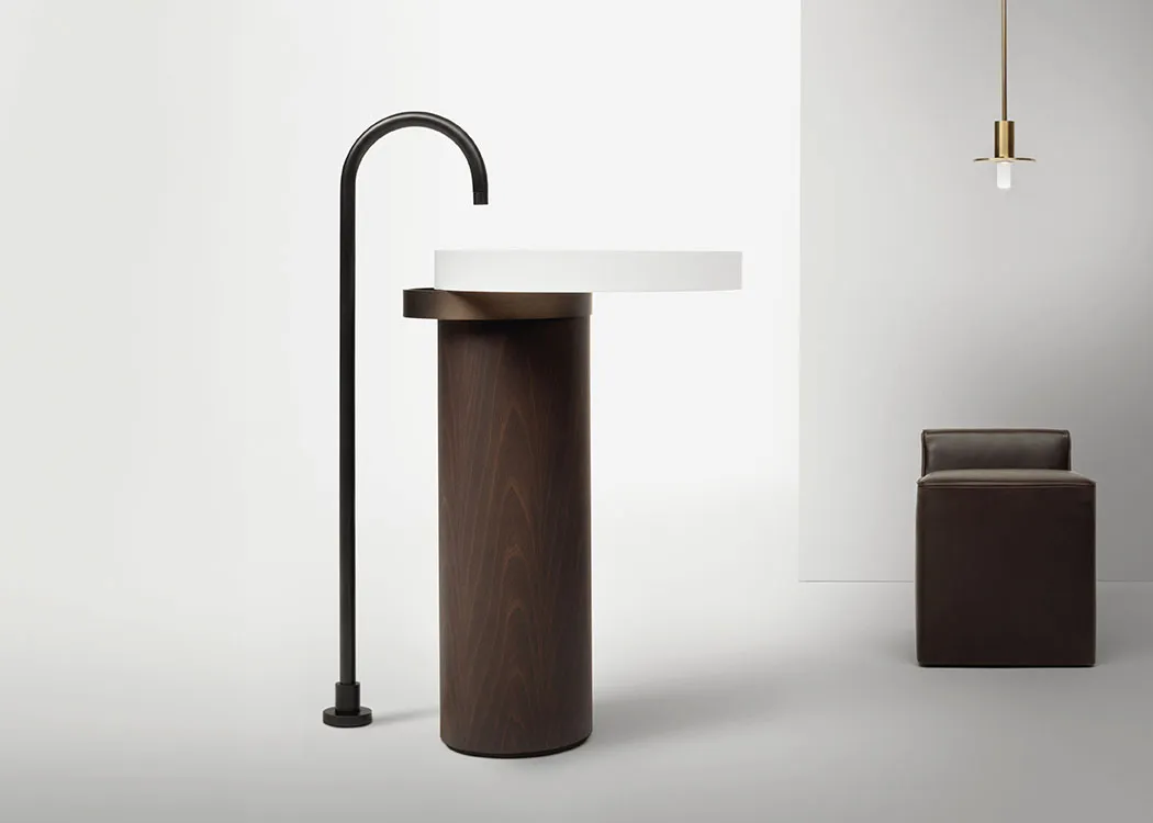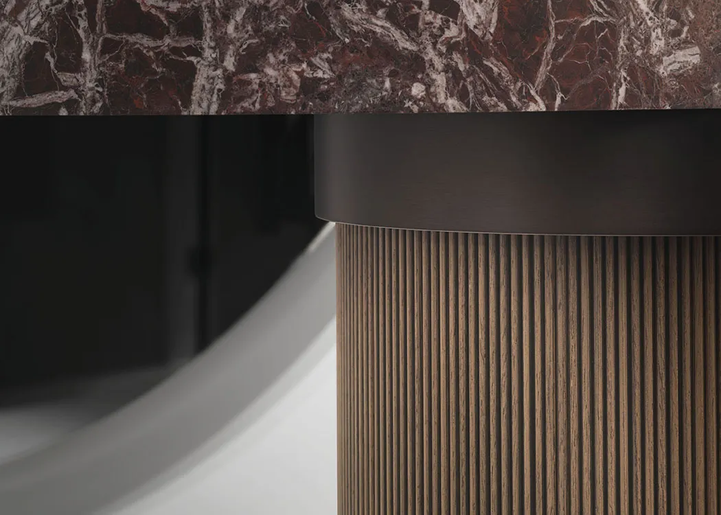 Культовый дизайн дополняется включением ценного дерева rigatino, реечной обработки, выполненной из массива дерева, что добавляет нотку тепла и изысканности в ассортимент. Доступные отделки будут все отделки Falper на основе ореха и дуба, в сочетании с металлами и мрамором, которые характеризуют коллекцию.