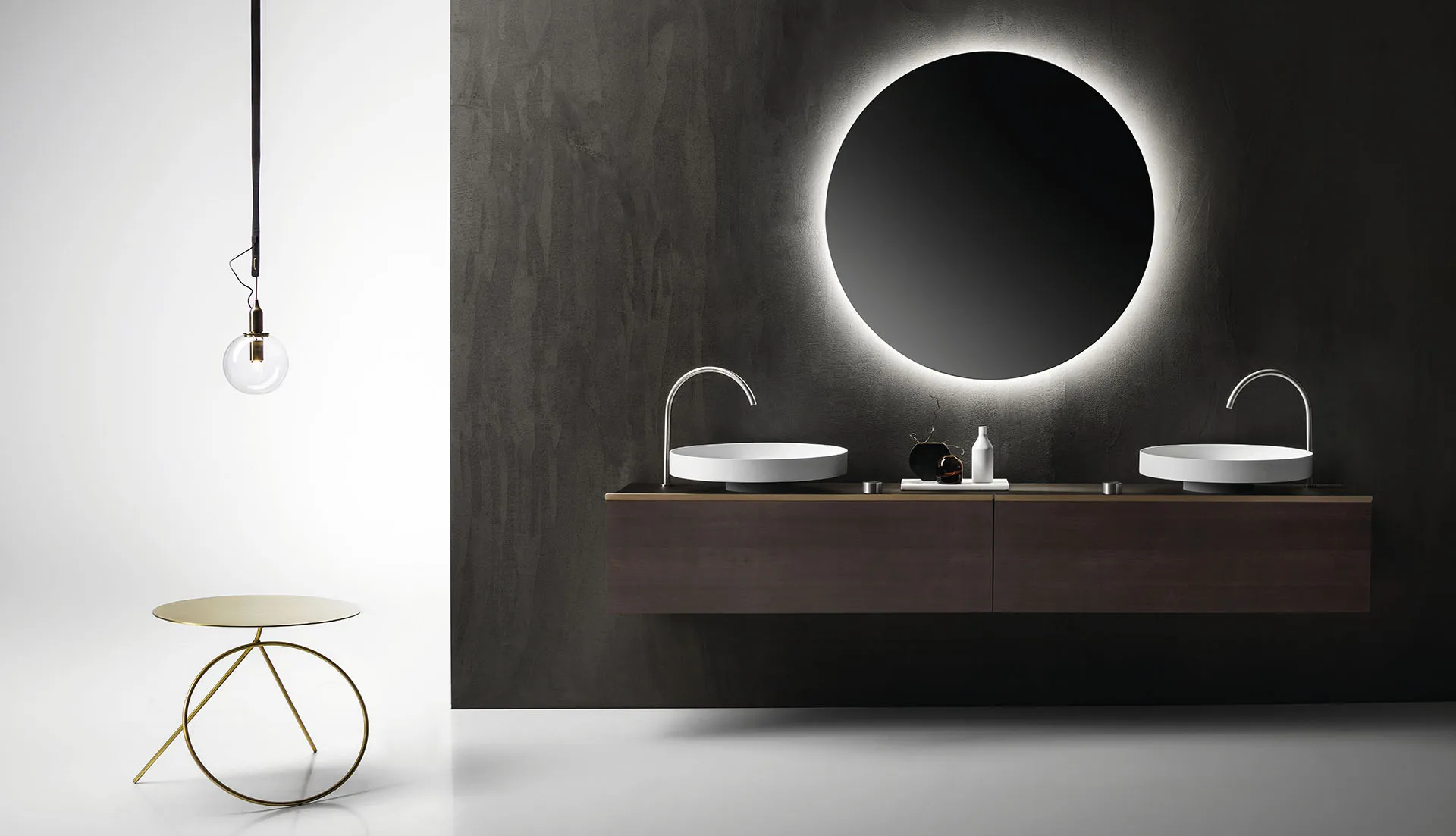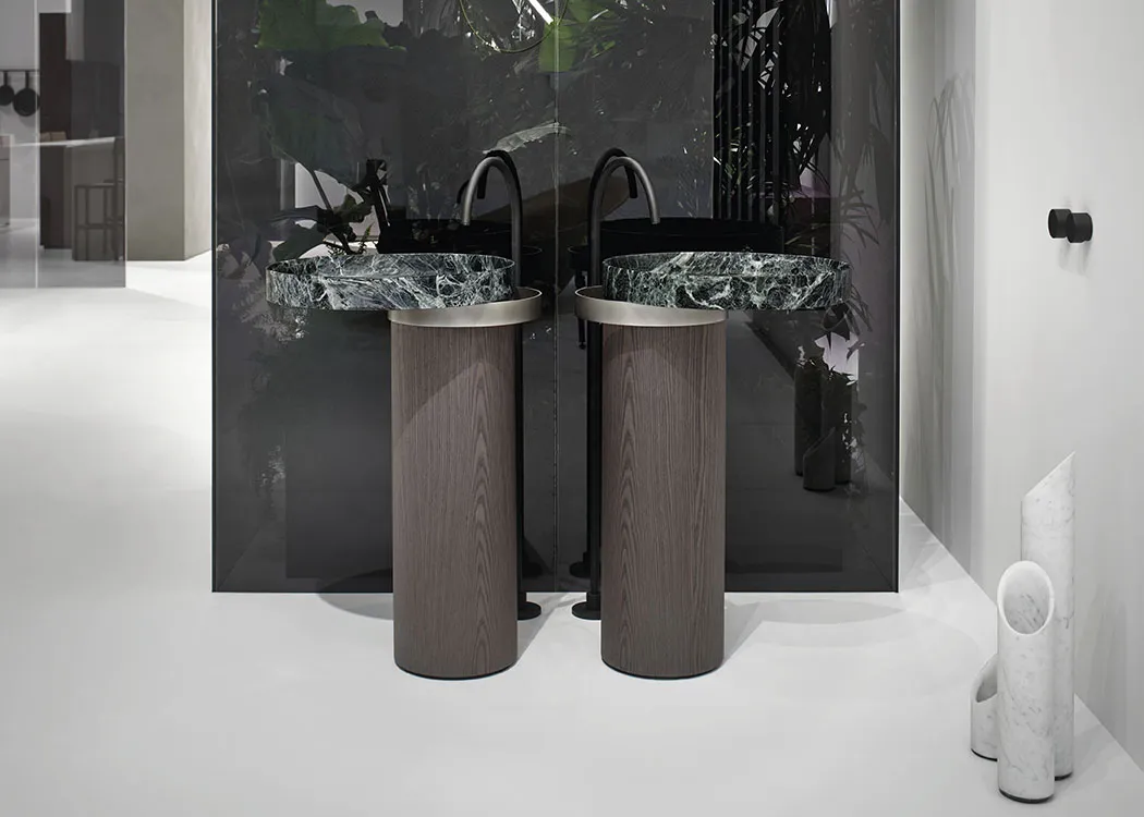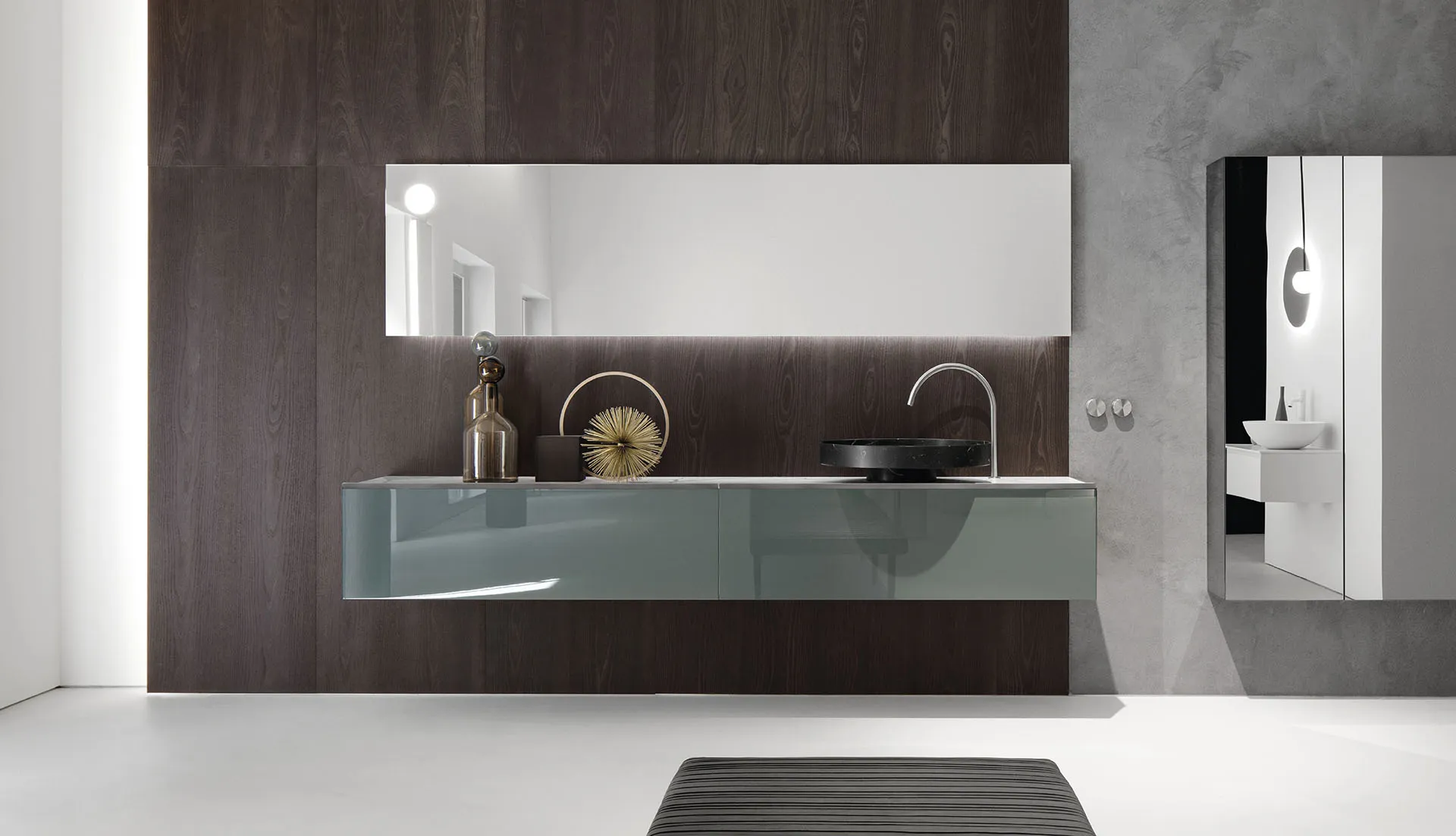 Коллекция включает в себя шкафы для умывальников, шкафы для хранения, столешницы и отдельно стоящие раковины, выполненные с использованием различных материалов.