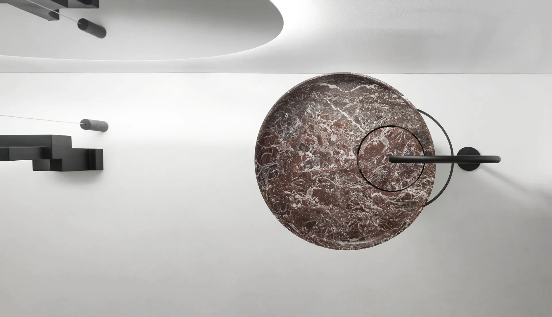 Коллекция характеризуется культовой круглой столешницей и сквозной стальной ручкой, которая определяет элементы конструкции под углом 45 градусов.