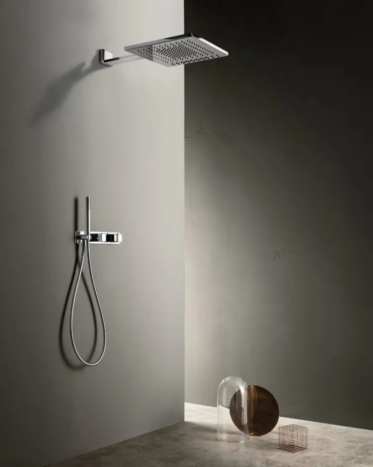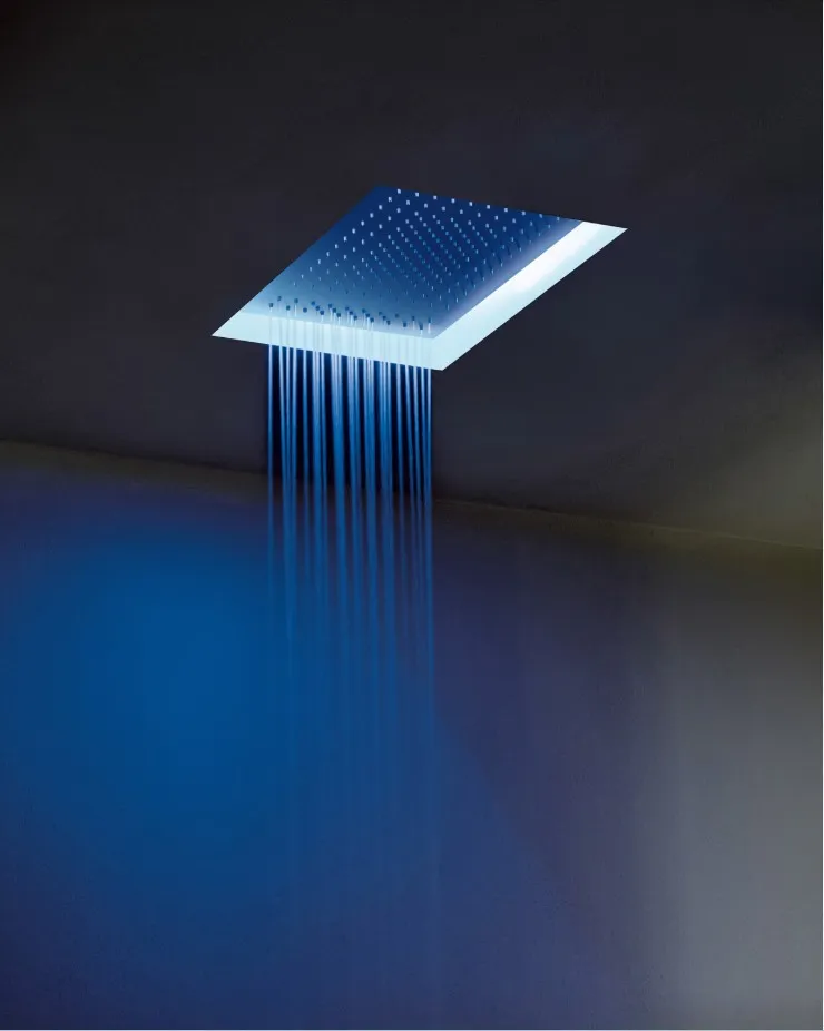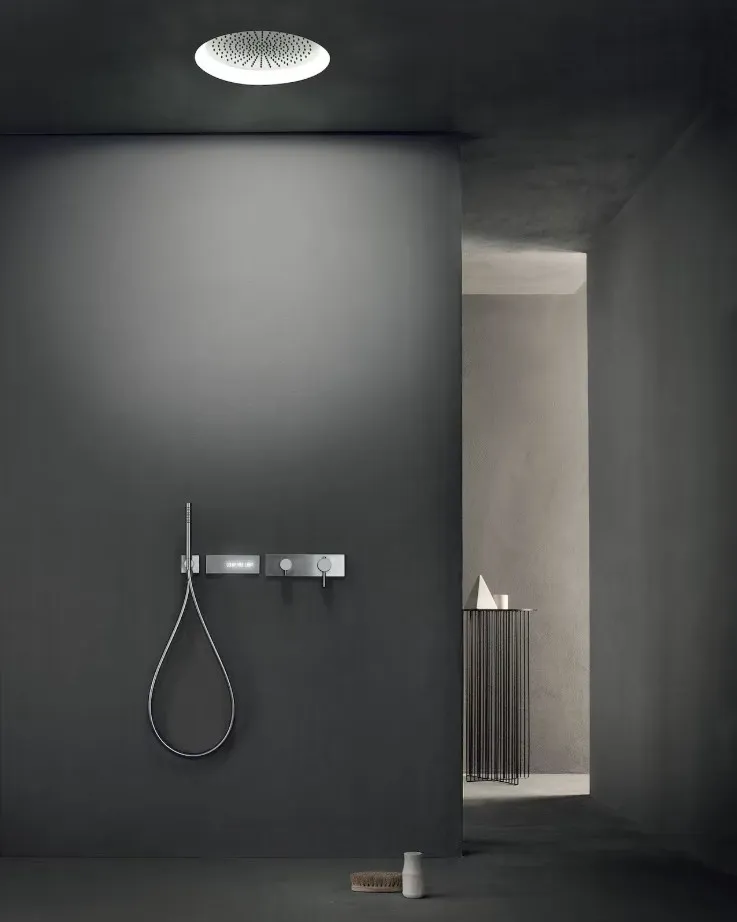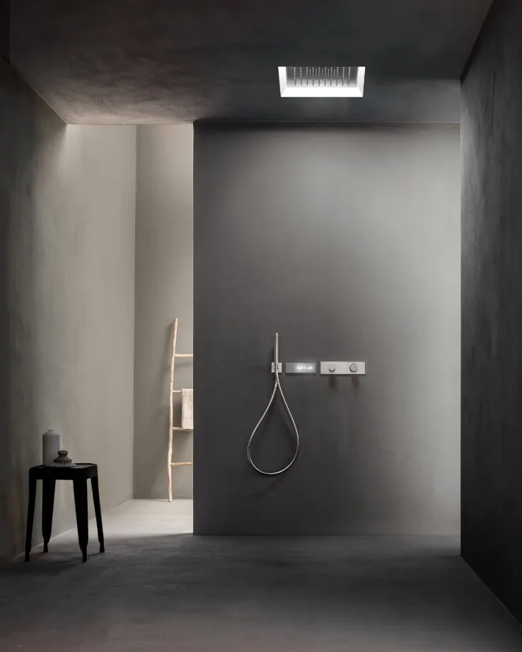 Коллекция Acquafit от Fantini - это многофункциональный и мультисенсорный душ, доступный как в квадратном, так и в прямоугольном исполнении, для установки на потолке, состоящий из встроенного элемента, частично встроенного элемента и внешнего элемента.