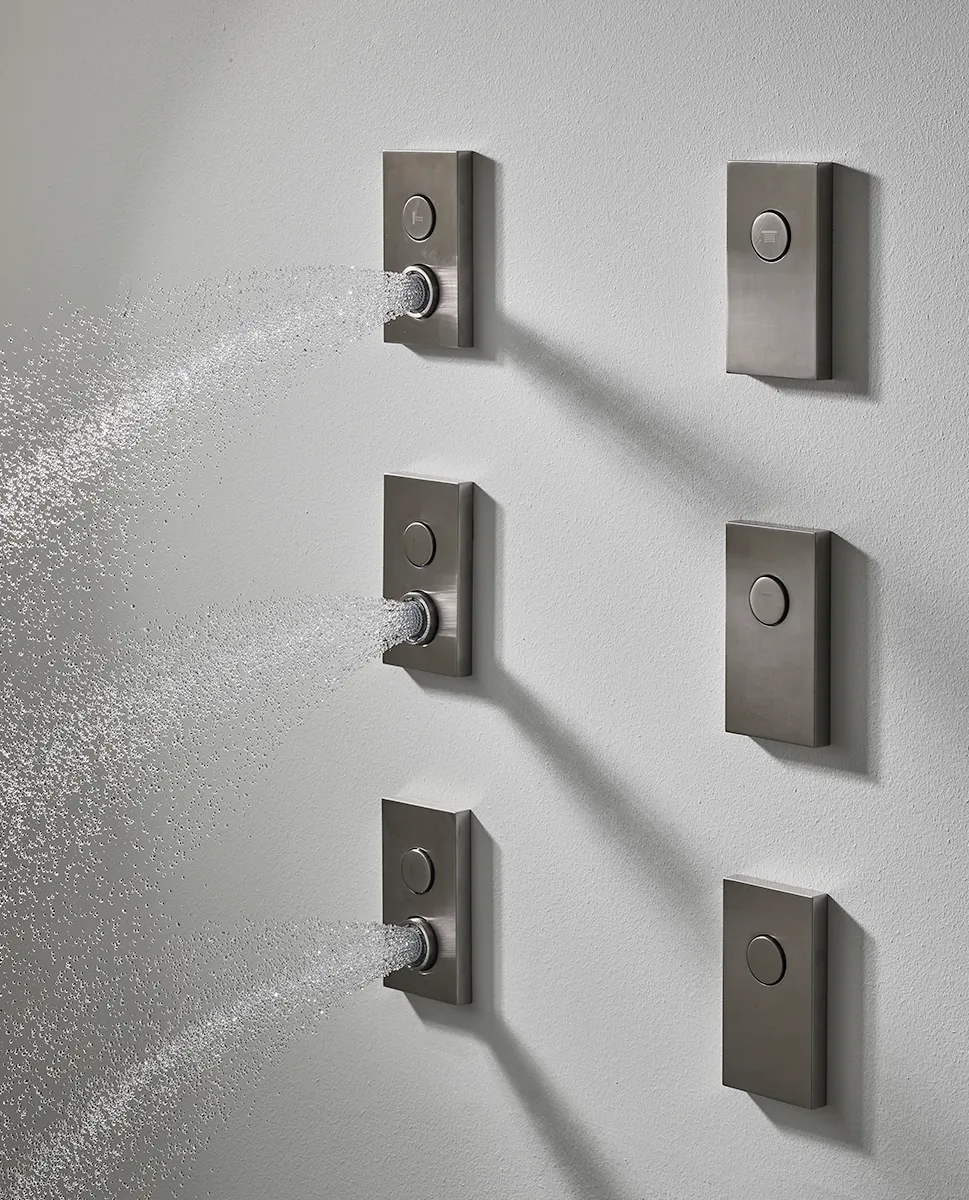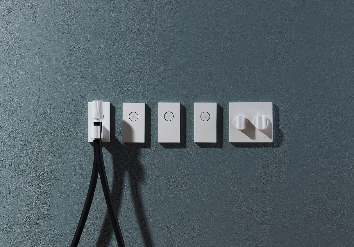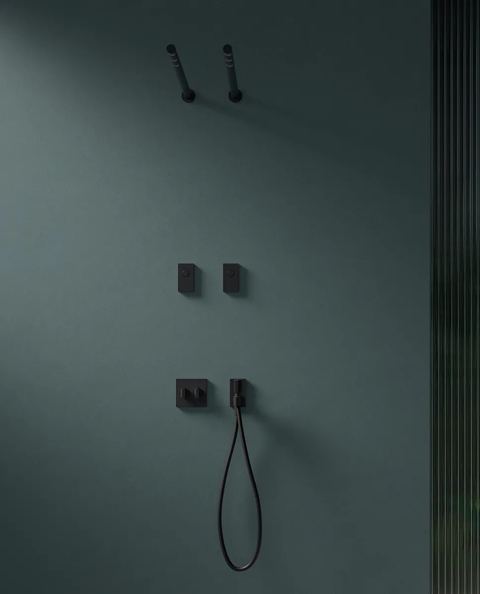 Система коллекции Switch компактно размещена в небольшом корпусе с регуляторами расхода и температуры, а также кнопками включения/выключения для подачи воды из душевой лейки и/или ручного душа.