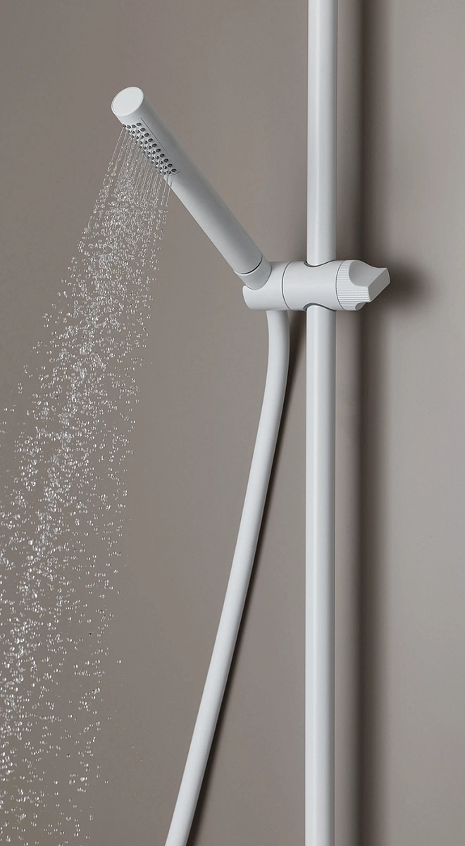 Рифленая поверхность культового ручного душа напоминает дизайн ручек модуля управления, а эргономичная рукоятка с вертикальным аэратором обеспечивает естественное принятие душа.