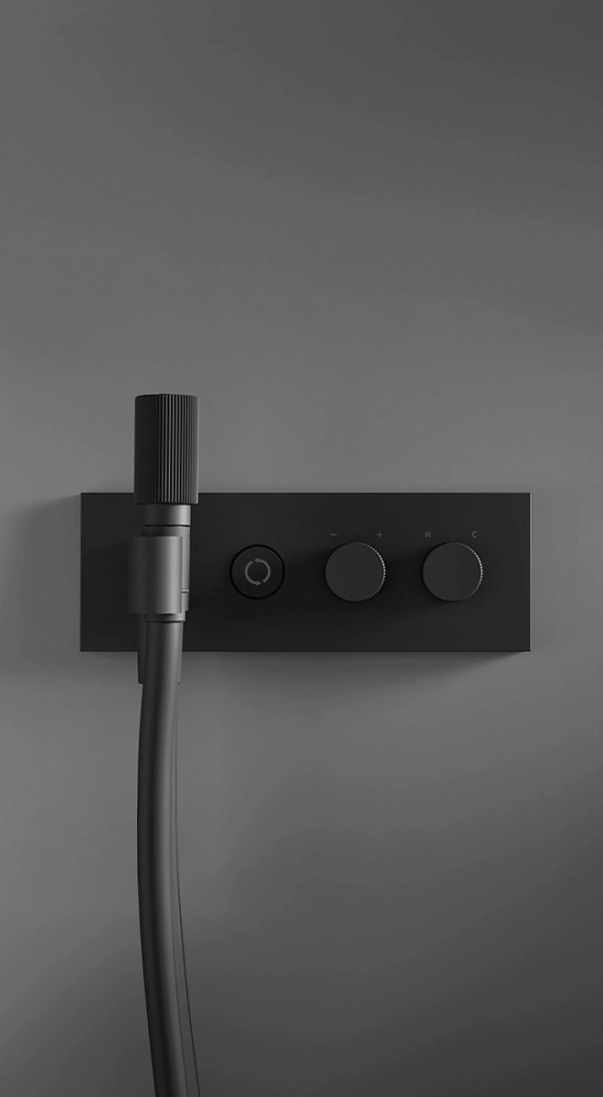 Душевая система оснащенf кнопкой, которая позволяет быстро выбрать нужную насадку простым нажатием. Две ручки с накаткой позволяют открывать и регулировать поток/температуру. Эта новая душевая система была специально разработана как простое и практичное решение.