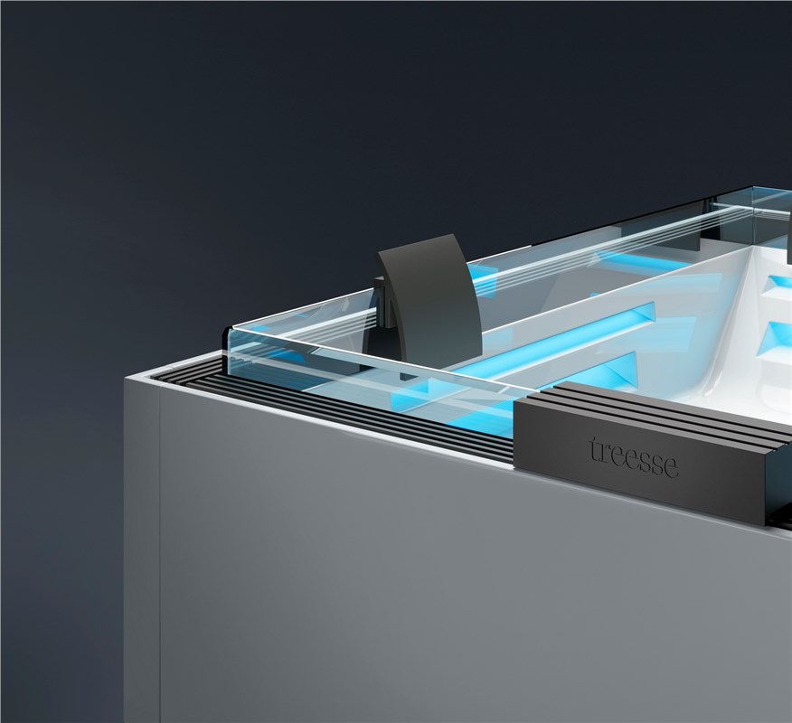 Выбор стеклянной ванны infinity edge обусловлен инновационным дизайном конструкции спа-салона и несколькими техническими изменениями, которые повышают функциональность гидромассажной ванны, сохраняя при этом эстетический минималистский стиль, типичный для спа-салонов Treesse. Две подушки большего размера скрывают интуитивно понятные и простые в использовании органы управления гидромассажем. При необходимости они трансформируются в удобные сиденья. Благодаря использованию ЛЬДА процесс релаксации становится еще более захватывающим.