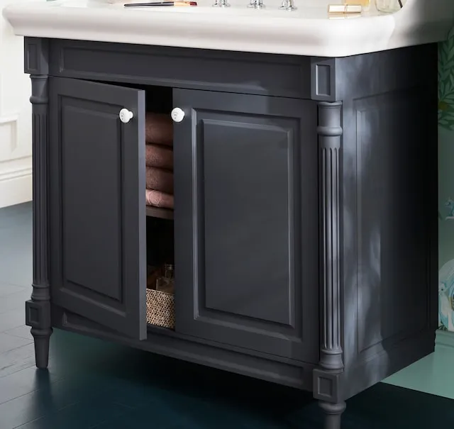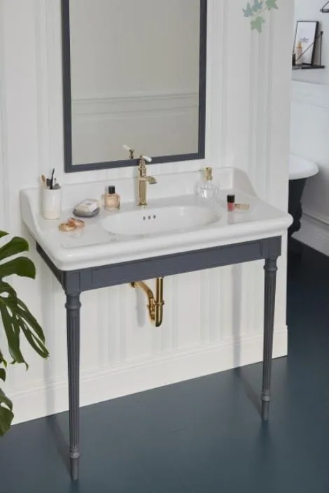 Традиционный дизайн с молдингами, ножками из массива дерева с канавками и ручками в виде накладок с трафаретной печатью. Коллекция состоит из консоли, кронштейнов и тумбы для дополнительного хранения.Изящно выполненный смеситель