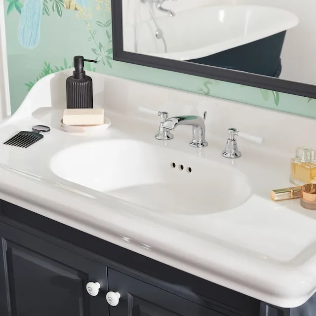 Керамика, вдохновлённая неоклассическим стилем, перенимает дизайн прошлого и адаптирует его к современным технологиям. Эта отдельно стоящая столешница с глянцевой белой отделкой имеет широкий диапазон установки и высокую тумбу под раковину для повседневного комфорта.Комплект мебели в стиле Людовика XVI