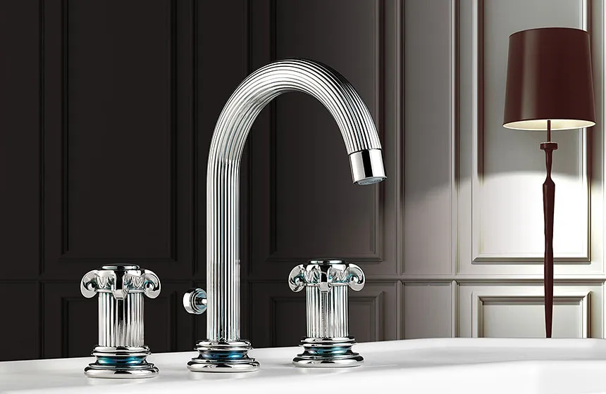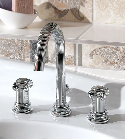 Грациозный силуэт смесителей и дизайн деталей сантехнической арматуры и аксессуаров для ванной комнаты Aphrodite воспроизводят элементы ионического архитектурного ордера, считавшегося самым женским в древнегреческой культуре.
