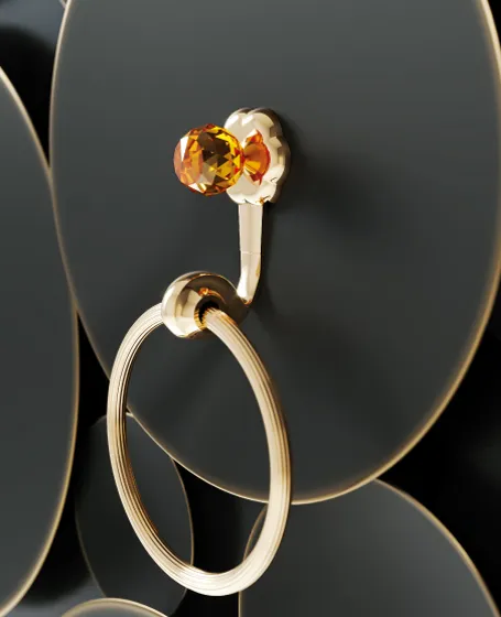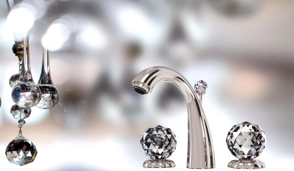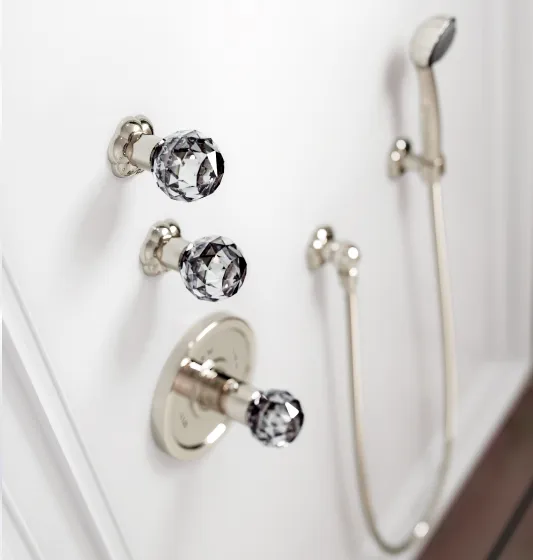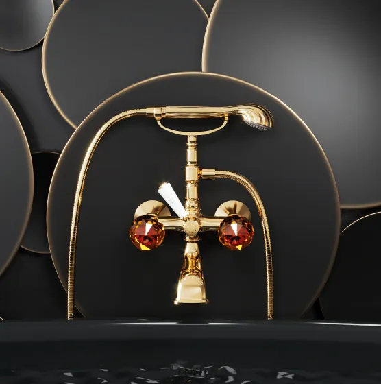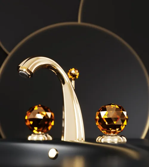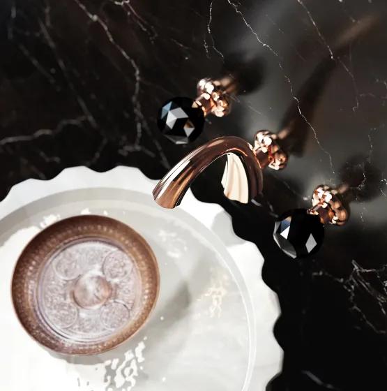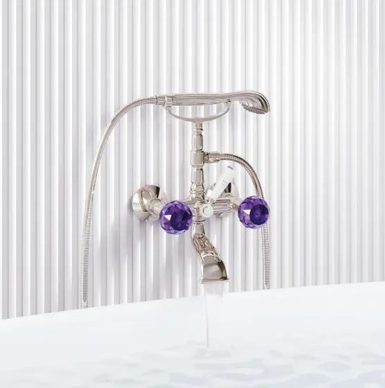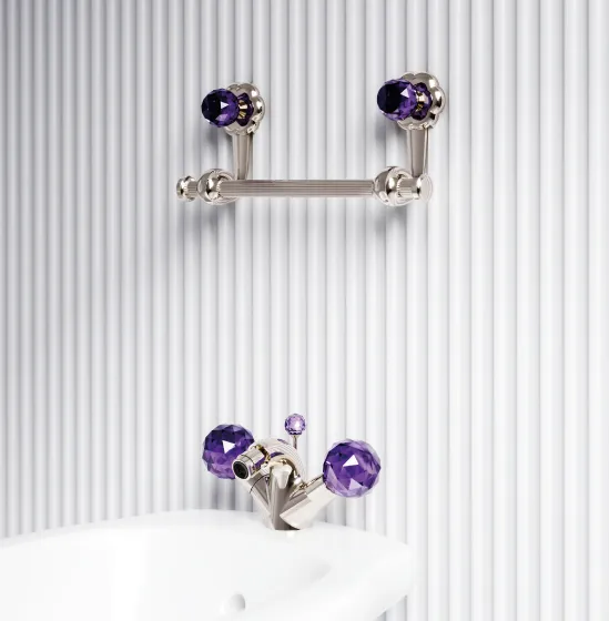 В серии Florale Crystal соединились хрупкая нежность цветка, блеск кристаллов и сильный цветовой акцент. Ручки смесителя и аксессуаров декорированы кристаллами Jörger четырёх выразительных цветов: чёрный, прозрачный, янтарный и аметистовый. Причём, кристалл «аметист» при разном освещении проявляет свойство хамелеона и меняет тон с сиреневого на голубой.