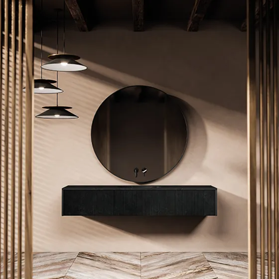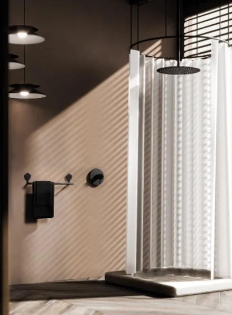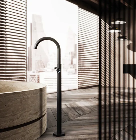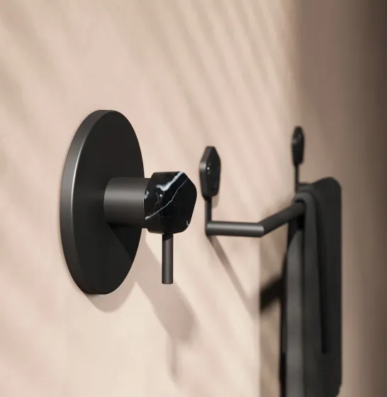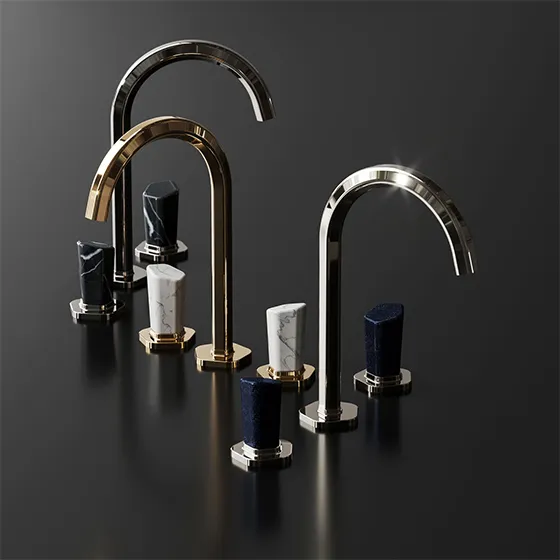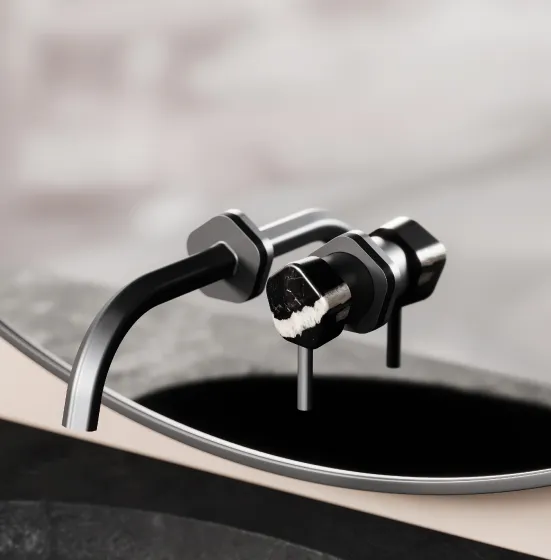 Вырастающие из фигурных розеток, выточенные из цельного камня объемные ручки-стелы задают новую высоту в дизайне ванной: натуральный камень как полноценный функциональный элемент, а не часть декора.