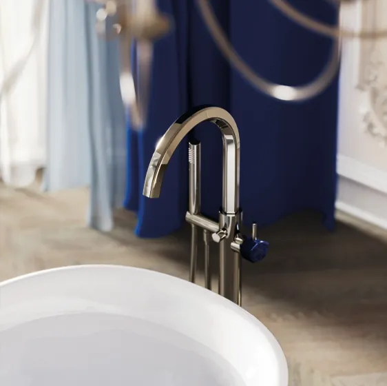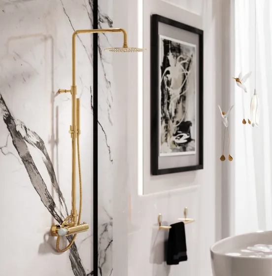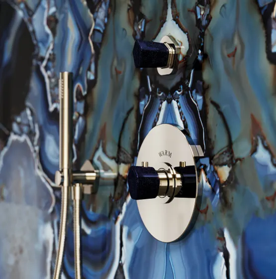 Интригующе-искрящаяся синева авантюрина, гордая выразительность чёрного мрамора или нежное очарование белой бирюзы – выбор декоративного камня и металла-компаньона подает яркие идеи для смелых стилевых трансформаций Shadó и интерьера ванной в целом.
