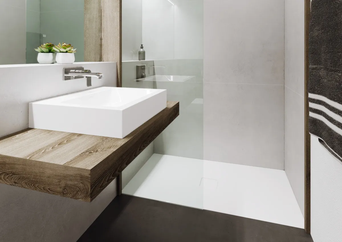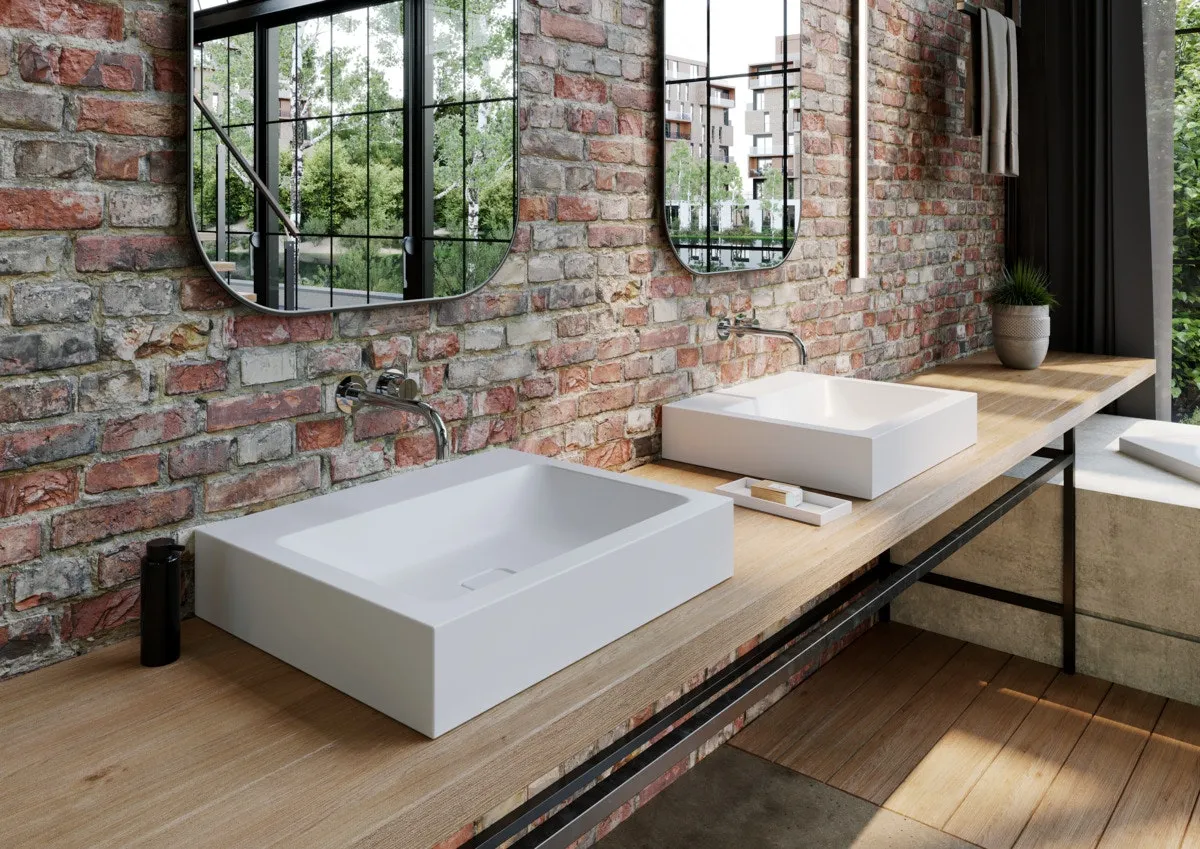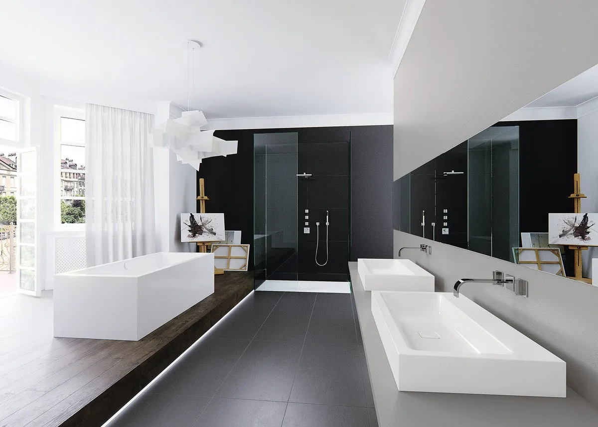 Оптимально встроенный эмалированный слив идеально завершает геометрический образ