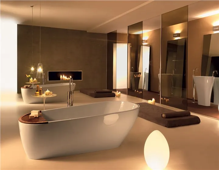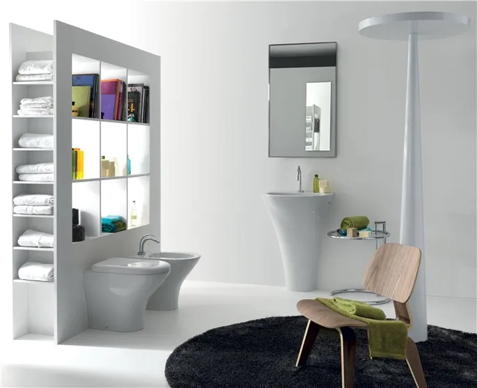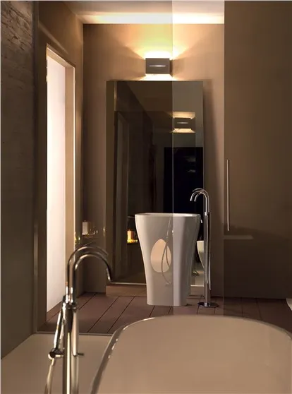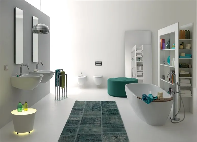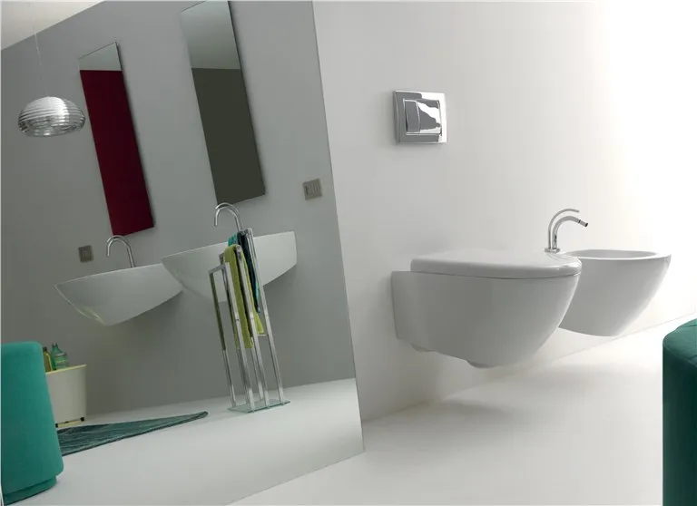 Ванна изготовлена из Pietraluce, а остальные аксессуары для мебели изготовлены из высококачественной керамики с сертификатом качества "Сделано в Италии". Сантехника: биде и унитазы, предназначенные для экономии воды, Коллекция Aquatech включает в себя несколько моделей, таких как настенные унитазы и биде, светильники, расположенные заподлицо с полом, а также унитазы, расположенные рядом. Особенность настенной сантехники заключается в авангардном дизайне, в котором угол наклона неочевиден по сравнению с обычным дизайном, а сантехника сужается к стене и расширяется книзу спереди, как будто достигает пола. В результате достигается оптический эффект прямой кривизны.