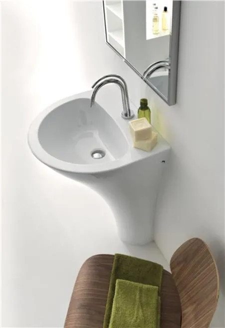 В коллекции три раковины: первая представляет собой настенный умывальник с одним отверстием (70x52), выполненный в том же футуристическом дизайне, который уже описывался выше для сантехники. Монолитный умывальник (60x51x85) выступает из земли в виде удлиненной колонны и установлен заподлицо со стеной. Отдельно стоящий умывальник имеет еще более монументальный внешний вид благодаря своим размерам (60x40x85), которые придают индивидуальность ванной комнате. Благодаря удлиненной форме он также подходит для общественных мест.