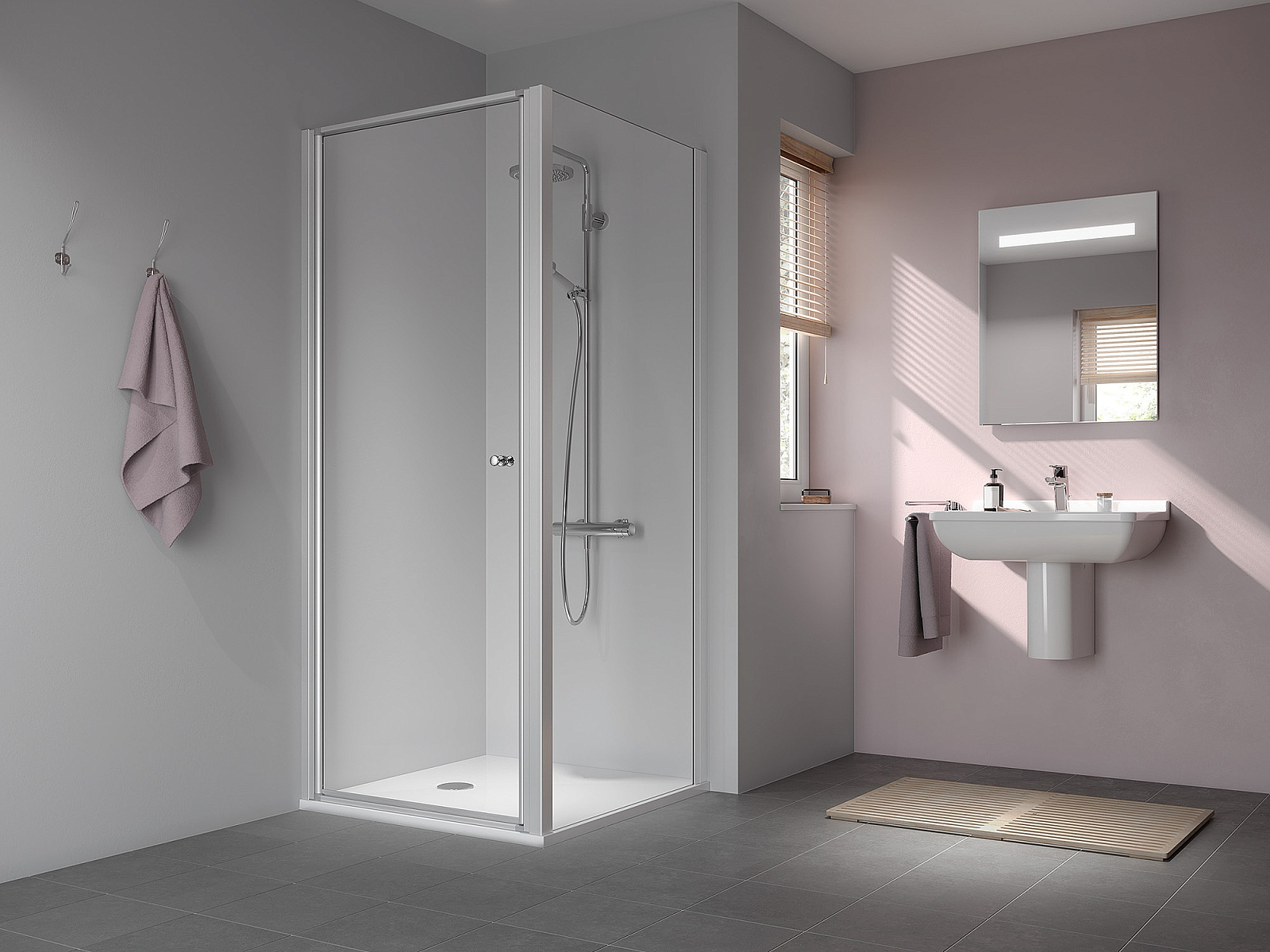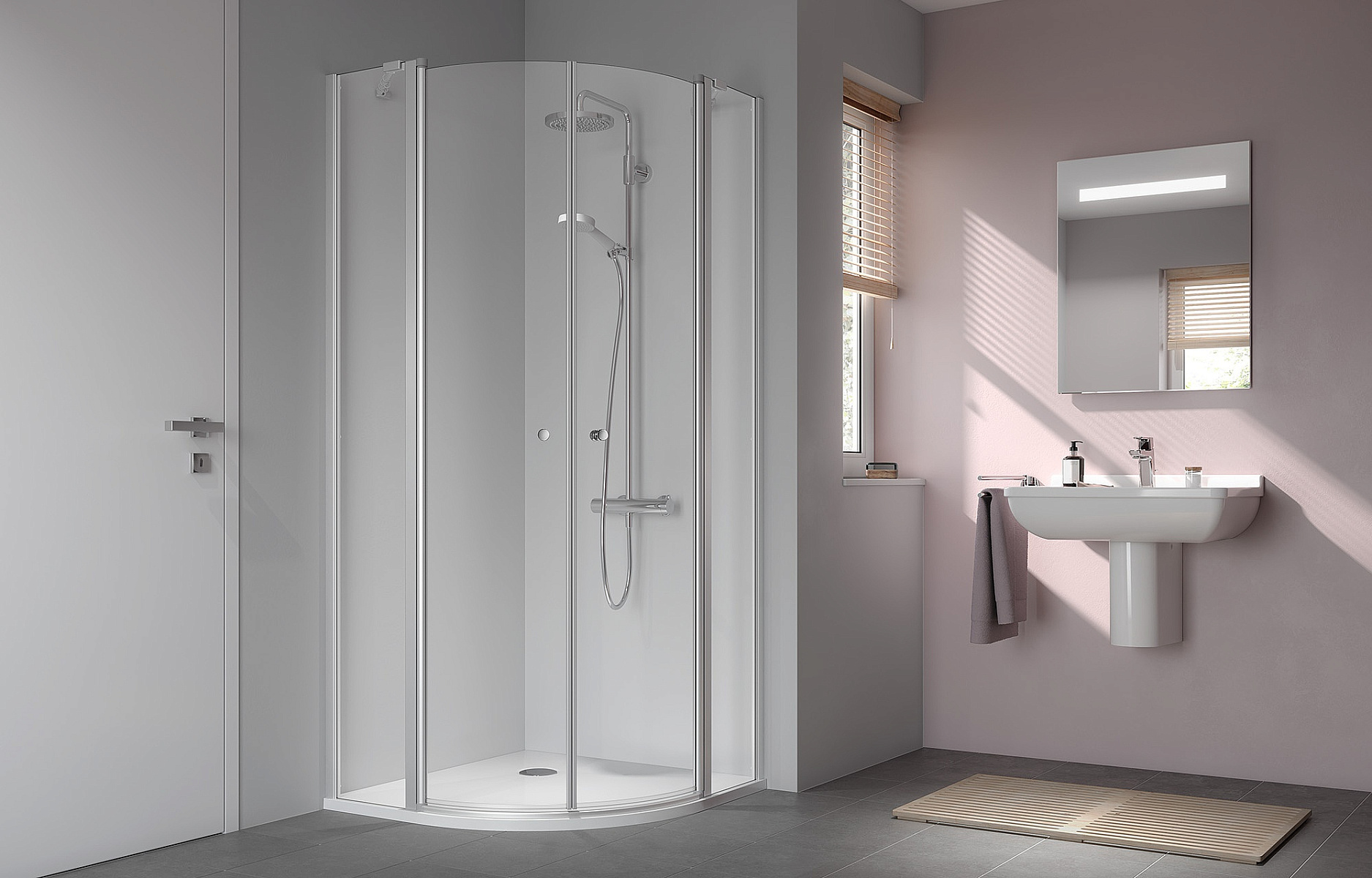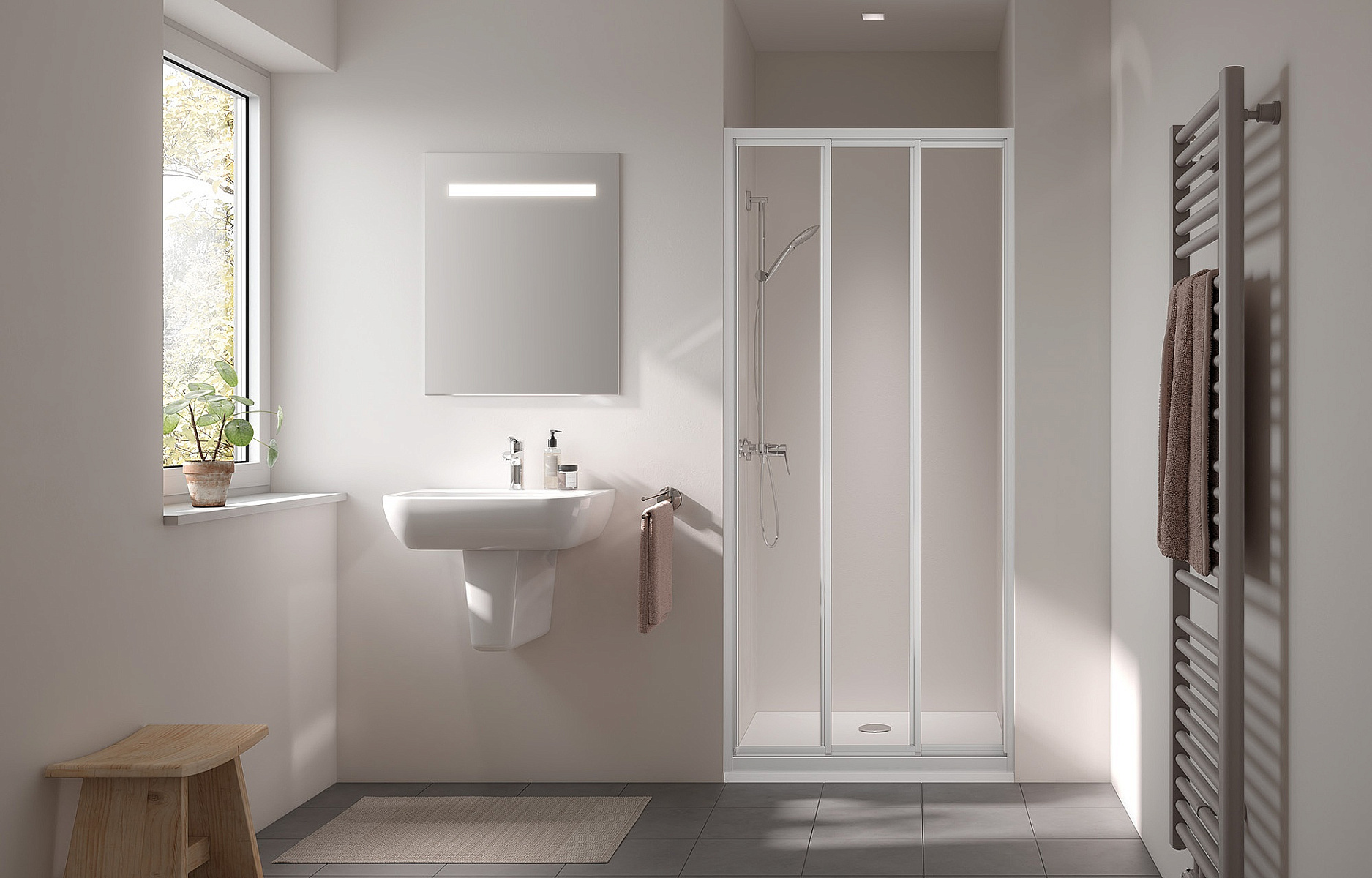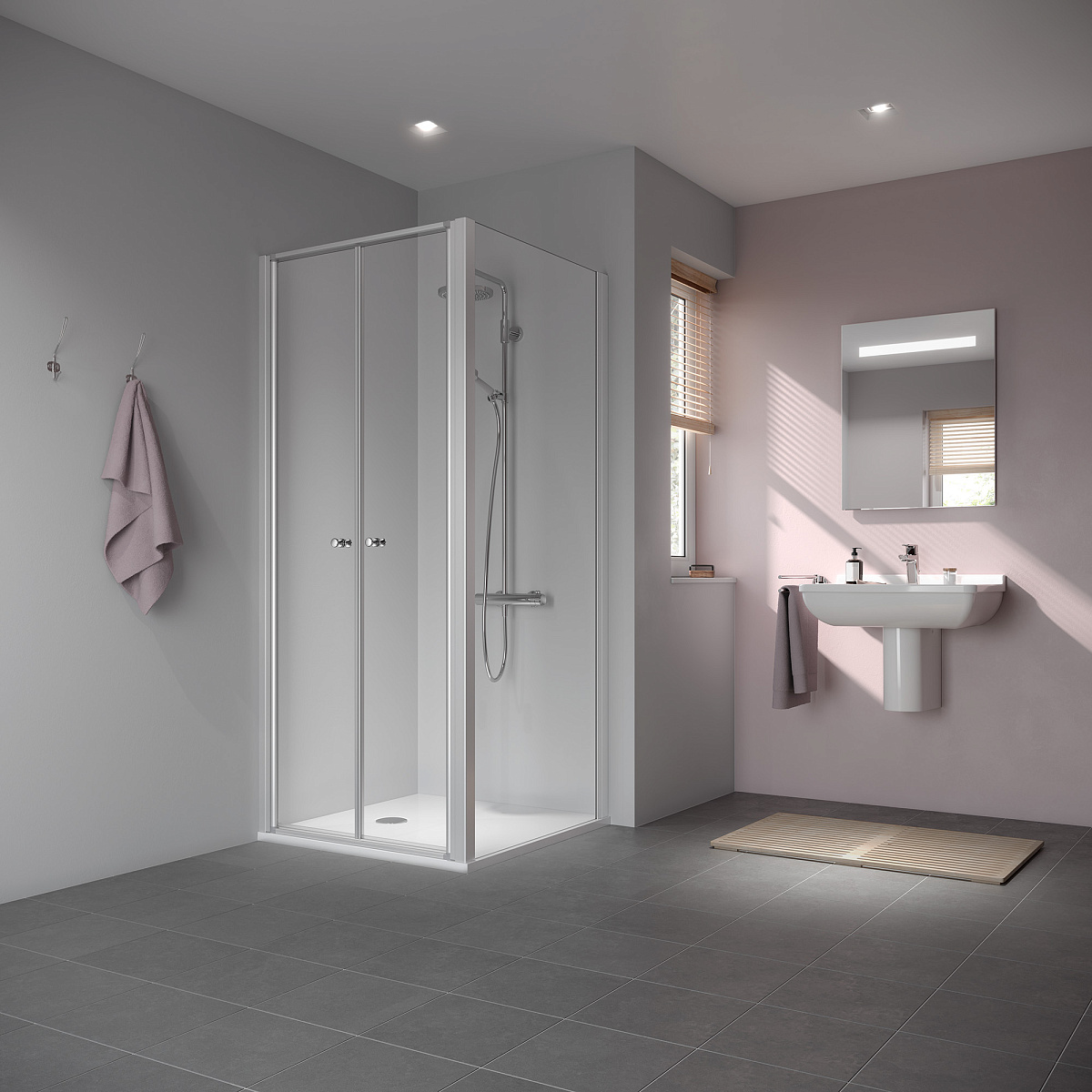 Комбинация угловых входных откидных и раздвижных дверей обеспечивает максимально легкий доступ в небольшую ванную комнату.
