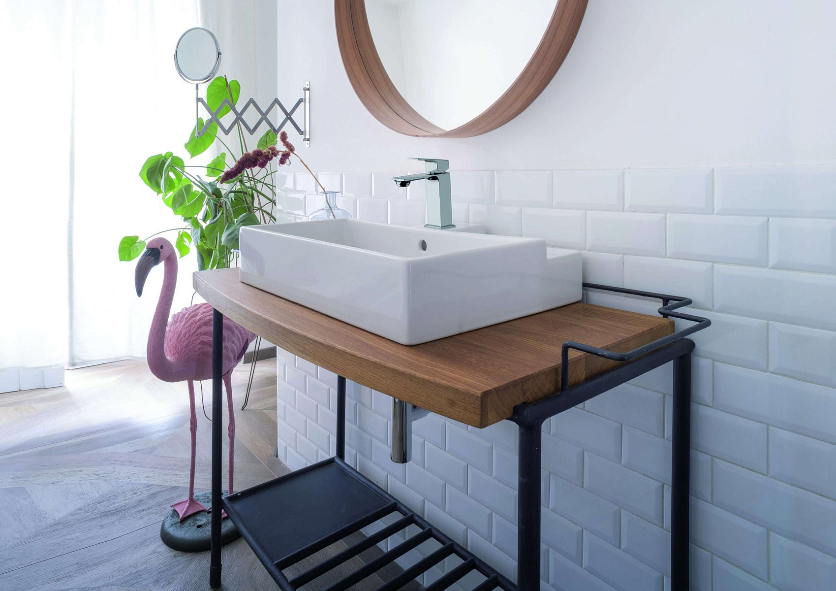 Доступен в хромированной и матовой черной отделке с латунной ручкой, для любителей более смелого прикосновения.